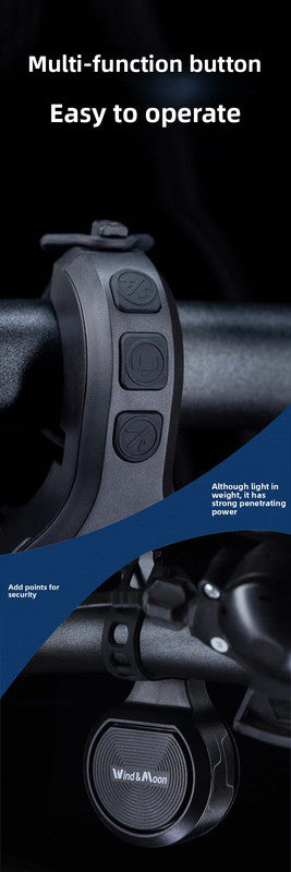 This multifunctional device is a must-have for any cyclist who values safety. The sleek black unit is compact yet durable, made from high-quality ABS and PC materials. The "Wind & Moon" style design is modern and unobtrusive on your handlebars. Operation is simple with intuitive buttons: one for the horn/bell and distinct controls for arming and disarming the alarm system.