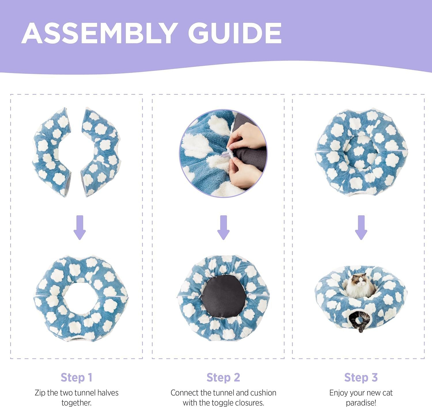 Assembly is quick and tool-free. The tunnel halves zip together securely, and the central cushion attaches via simple toggle closures. Whether you have a playful kitten or a dignified senior cat, this Purple Daisy Tunnel Bed offers the perfect balance of fun and relaxation.