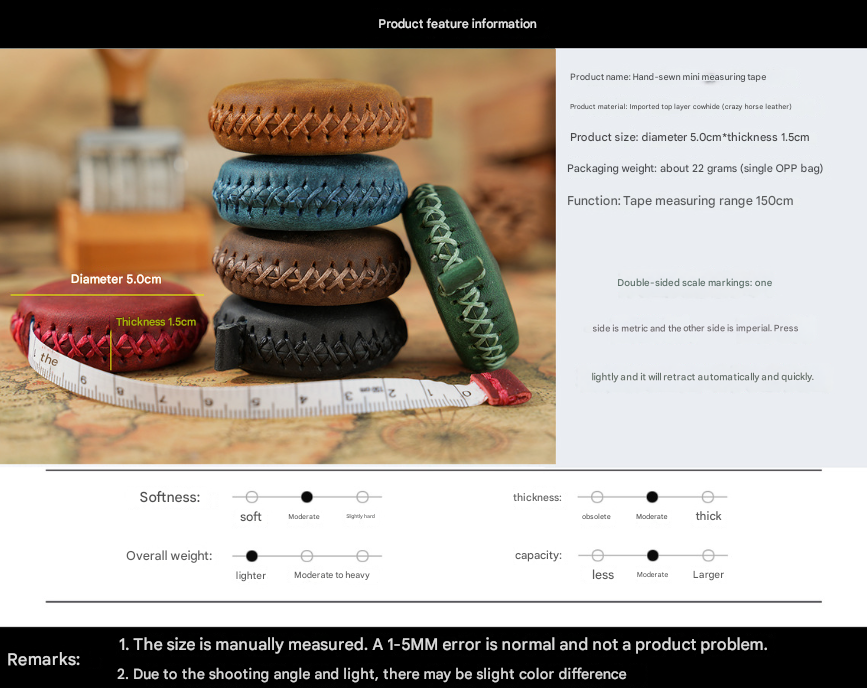 This charming handmade leather tape measure is both a practical tool and a stylish accessory. The top-grain cowhide leather casing features meticulous hand-stitched detailing around the edges, adding a touch of rustic elegance and durability. Its compact, circular design makes it easily pocketable.