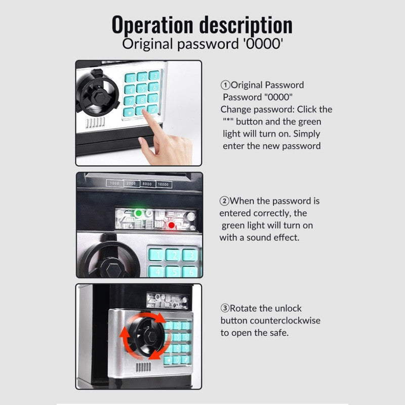 • Password Protection: Uses a personal four-digit password lock to secure savings, teaching kids about security and private access(Initial Password is 0000).