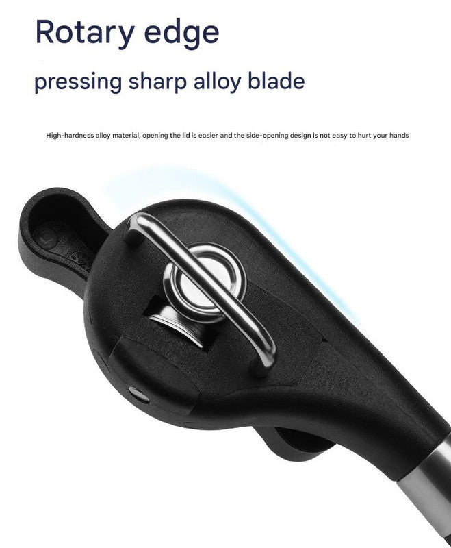 Effortlessly open cans with this innovative Multifunctional Can Opener, designed for safety, comfort, and durability. Its European-inspired design not only adds a touch of style to your kitchen but also features an advanced side-cutting mechanism that leaves no sharp edges on the can or the lid, ensuring your hands are protected. The high-hardness, corrosion-resistant alloy steel blade meets food-grade hygiene standards for safe contact with food. An upgraded, ergonomic handle fits comfortably in your hand, making the turning motion smooth and easy. This versatile tool also functions to lift pull-tabs, making it a true kitchen multi-tasker. A unique benefit is that the smoothly cut lid can be placed back on the can for temporary storage of leftovers. A hanging hole in the handle allows for convenient storage.