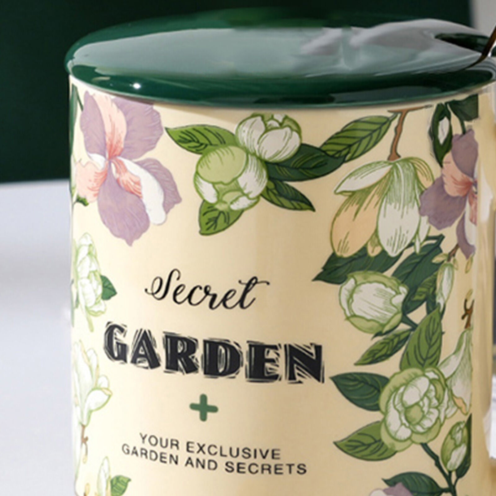 Introducing the Secret Garden Mug Set, featuring two tall mugs with complementary designs. One showcases a charming floral pattern, while the other features a leafy design, both accented with creamy yellow handles. The set also includes two matching lids to keep your beverages warm and two coordinating teaspoons for convenience. Beautifully packaged in a gift box, this set makes an ideal present for special occasions or a delightful addition to your collection.