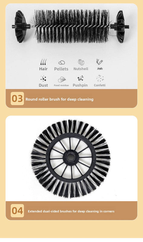 • Dual Side Brushes: Features two extended rotating brushes that effectively sweep dirt from corners, skirting boards, and edges directly into the suction inlet.