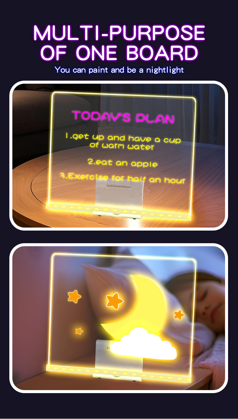 Spark your child's creativity with this LED light-up drawing board. It uses special fluorescent markers to create bright, glowing artwork that is easily erased for endless use, helping to eliminate paper waste. The soft LED lighting is designed to be gentle on the eyes. This versatile board serves multiple functions, including creative drawing, cartoon tracing, and working as a soothing night light, making it a wonderful gift or interactive decoration for holidays.