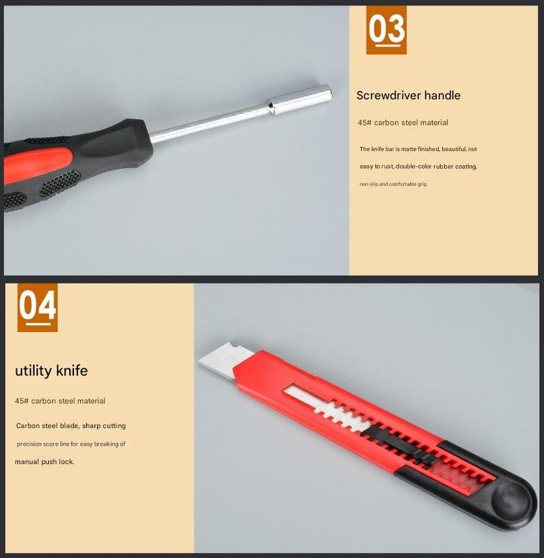 This 39-Piece Home Tool Kit is the perfect starter set for DIY enthusiasts or new homeowners. Packed with essential tools made of durable carbon steel and featuring a stylish red and black design, this kit has everything you need for basic home repairs and maintenance.