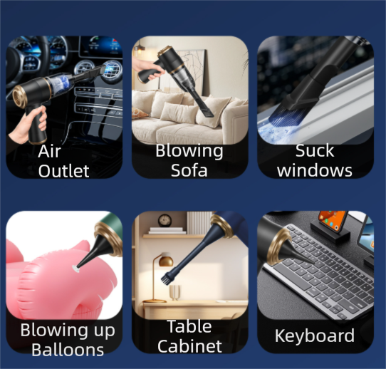 Keep your car, home, and office spotlessly clean with this powerful wireless handheld vacuum and air blower. Designed for ultimate convenience, this compact, lightweight device easily handles both large debris and fine dust. Its multi-functional design also allows it to be used as an air duster and tire inflator (functionality dependent on specific accessories).
