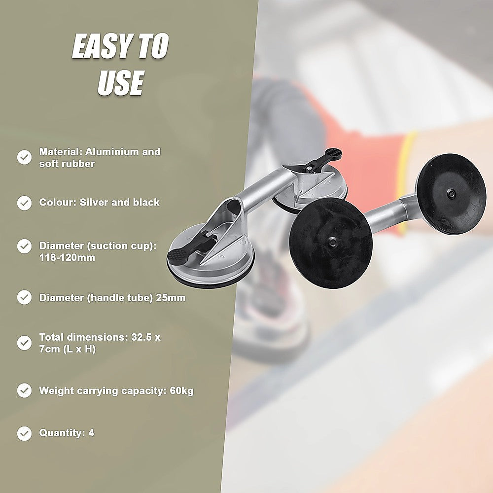 Need to lift materials safely so you can move them from place to place? This set of four double-suction cup glass lifters by Randy Travis Machinery is the perfect solution for DIYers and tradesmen alike. Able to handle items weighing up to 70 kilogrammes, these lifting tools' secret lies in their powerful vacuum suction cups. With light aluminium handles and two soft, cushiony rubber suction cups per lifter, these tools make it easy to carry not only glass, but also other smooth, difficult-to-transport materials, like tile, smooth plastic, and coated plywood. They're easy to use. Just place the suction cups on the material, fold down the levers, and like magic the cups grip the sheet of glass or other material, allowing you to carry it easily to your home or work site.
