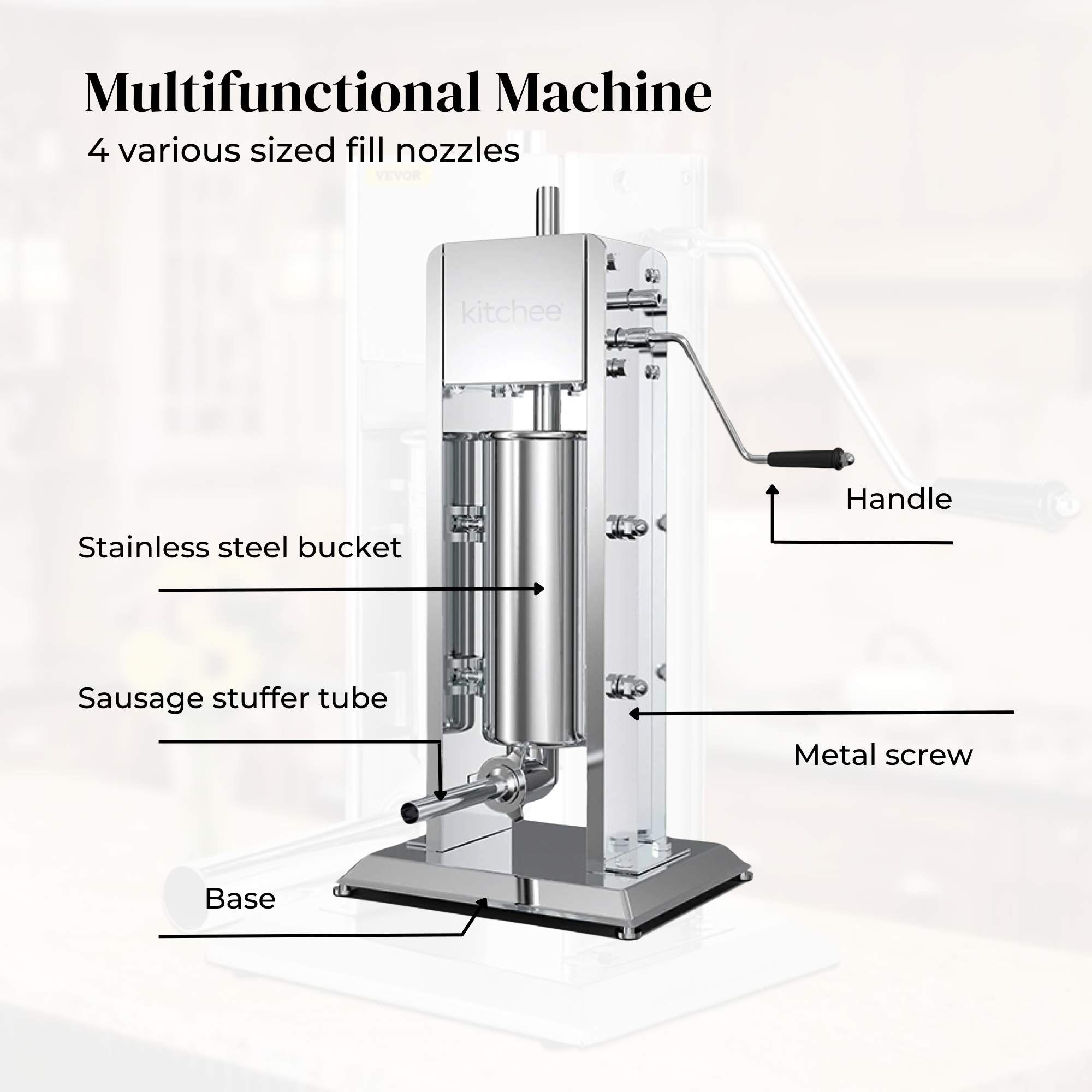 This sturdy 5L Manual Vertical Sausage Stuffer Machine is designed to be mounted securely onto any surface. The tank and various sized filling nozzles are made of a high grade, food safe 304 stainless steel for quality and durability.