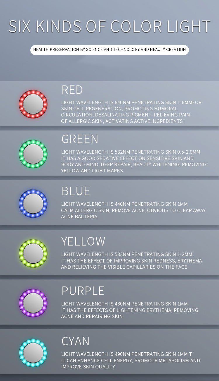 Purple (430nm): Penetrates skin 1mm. Has effects of lightening erythema, removing acne, and repairing skin.