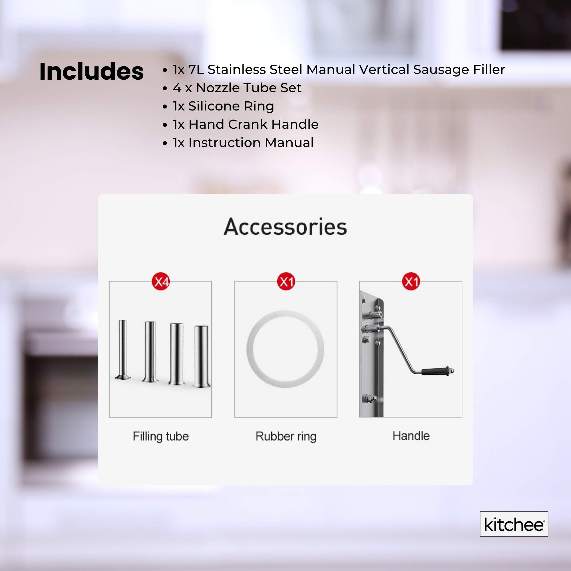 This sturdy 7L Manual Vertical Sausage Stuffer Machine is designed to be mounted securely onto any surface. The tank and various sized filling nozzles are made of a high grade, food safe 304 stainless steel for quality and durability.