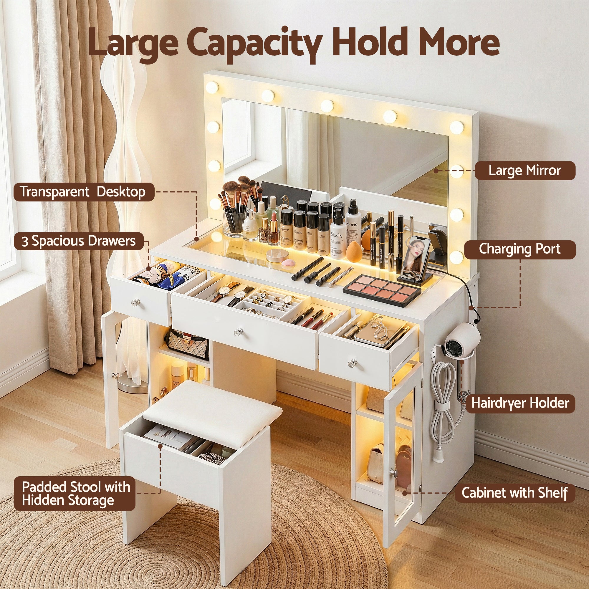 The Artiss Dressing Table is a modern vanity desk that brings together clean design and practical functionality. A large Hollywood style mirror with 11 LED bulbs and 3 adjustable colour modes creates balanced lighting, while RGB ambient lighting adds a refined touch to the space. The transparent desktop keeps the look light and contemporary, supported by smooth sliding drawers and cabinet storage that help keep beauty essentials organised. Thoughtful details such as a built in charging station, hairdryer holder, padded stool with hidden storage, anti tip strap and floor protectors make this LED lighted makeup vanity easy to use, stable and simple to maintain in bedrooms apartments hotels salons and studios.