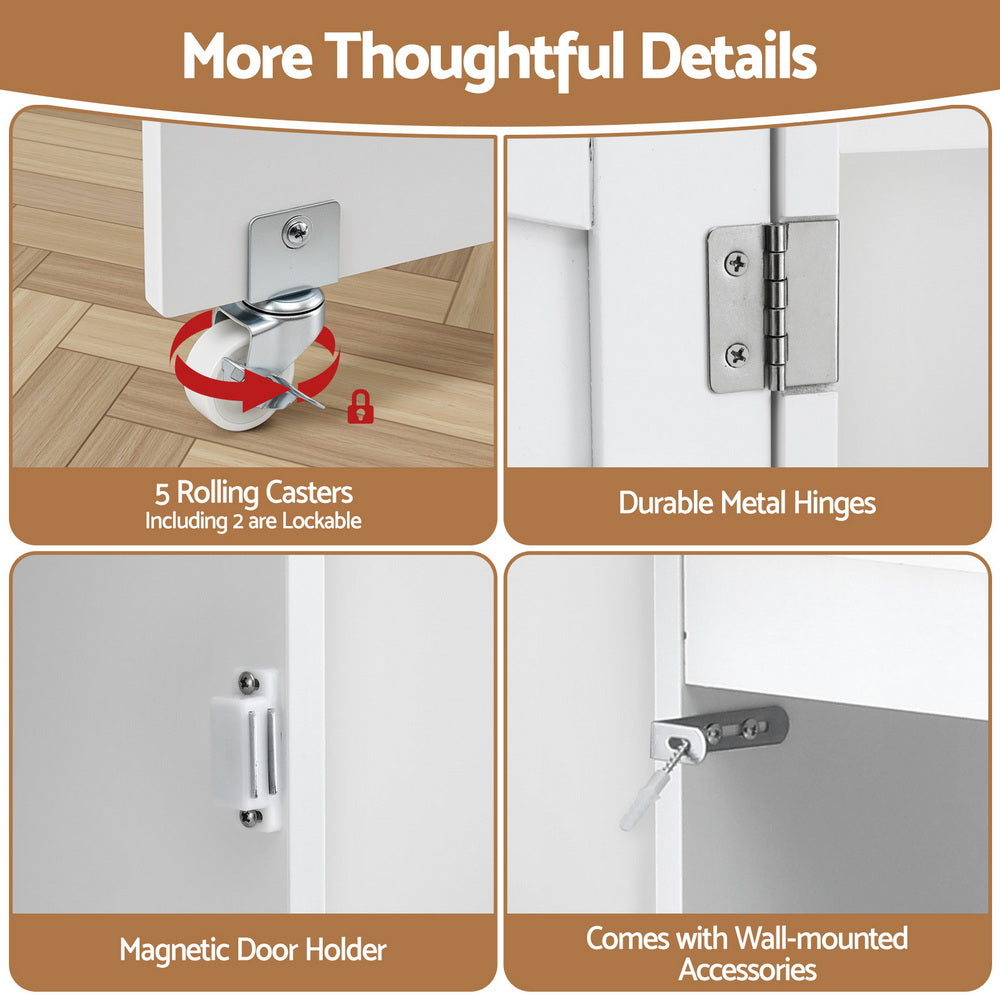 Revolutionize your creative space with this versatile folding sewing and craft table. Designed to be a compact solution for any home, it effortlessly folds out to reveal a spacious work surface and ample storage, including three storage bins and a shelf. Its five smooth-rolling wheels allow you to move your entire workstation anywhere you need, making it an ideal, multi-functional addition to your home for all your crafting, sewing, office or any other needs.