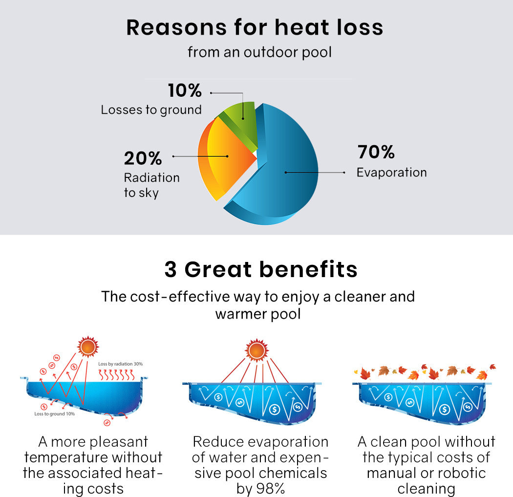 The Aurelaqua Solar Swimming Pool Cover also eliminates 98% of your pool's water evaporation and keeps expensive chemicals needed to maintain pool health from escaping through the surface.