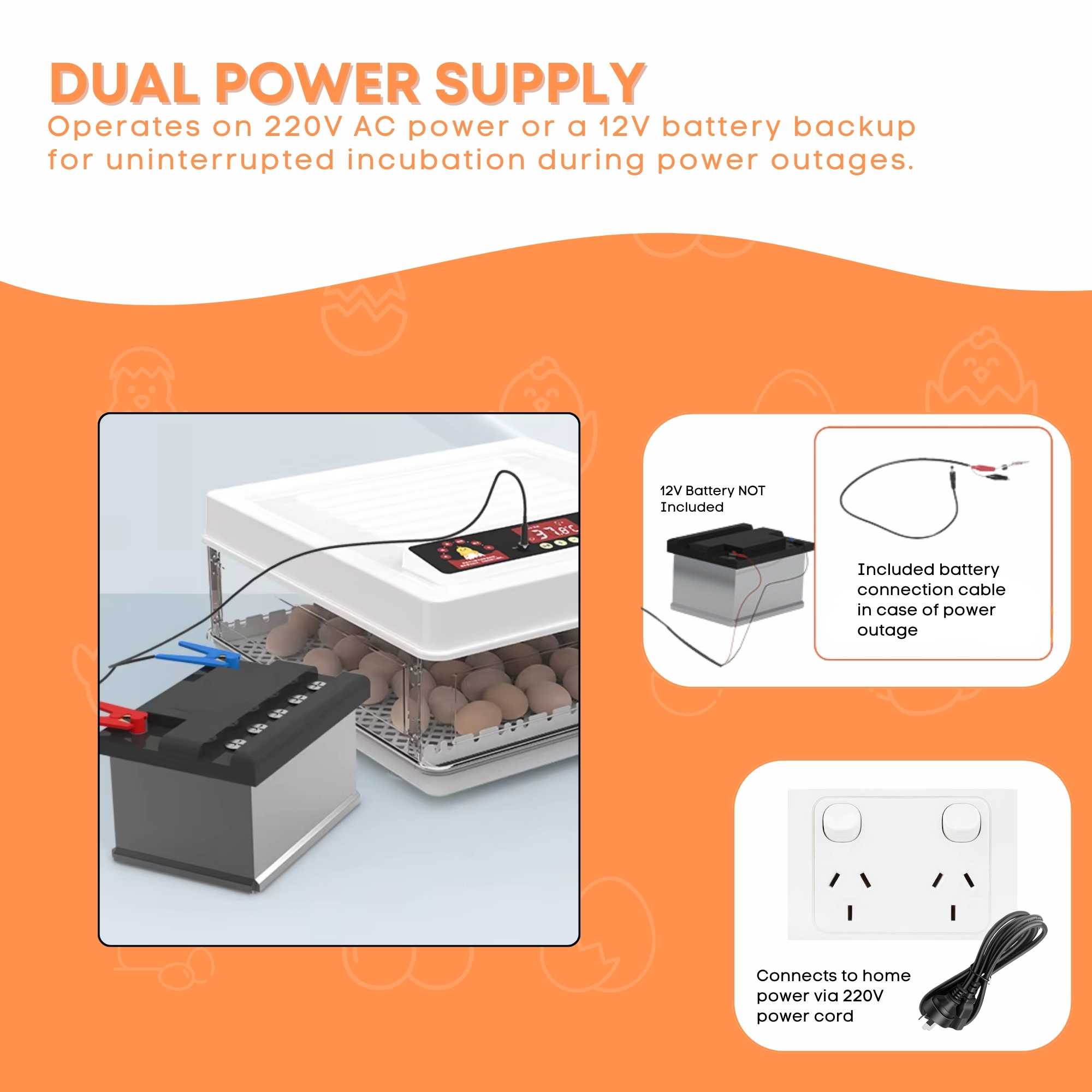 The 48-Egg Automatic Incubator is designed for poultry farmers and hobbyists looking for a reliable and efficient way to hatch eggs. This fully automatic incubator ensures precise temperature and humidity control, automatic egg turning, and even heat distribution, leading to a higher hatch success rate. Equipped with a reliable dual power system, it seamlessly switches to a 12V battery (not included) during outages, ensuring uninterrupted operation.