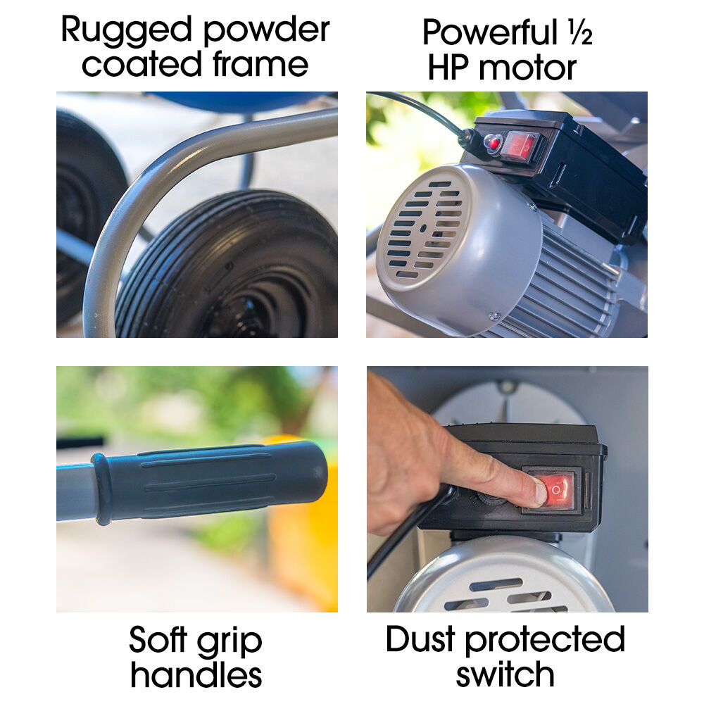 Designed for real job sites, the large 16 pneumatic tyres roll over rough terrain with ease, and the powder-coated steel frame is built to handle tough conditions.