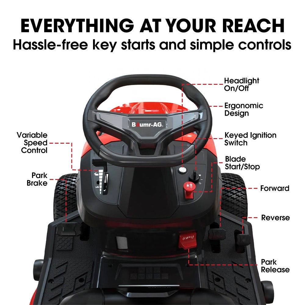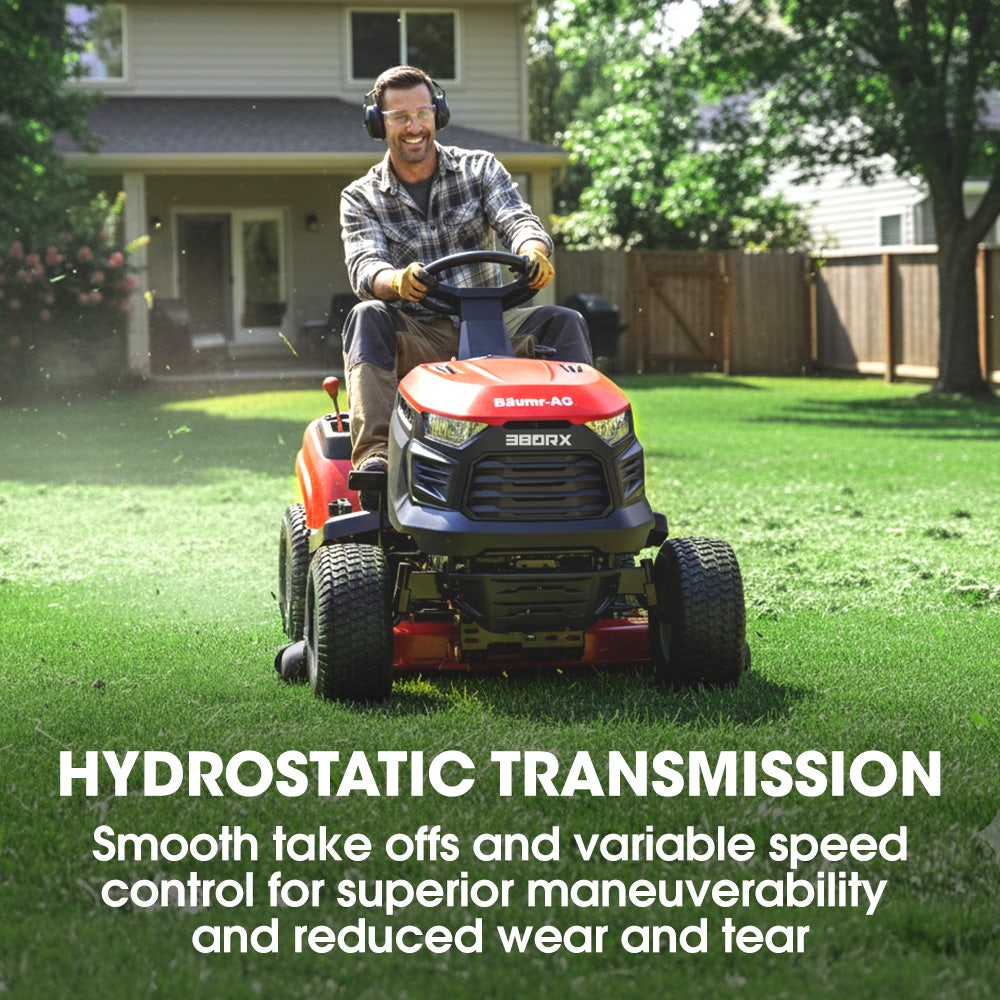 Power through demanding lawn care with the Baumr-AG RX380 ride-on mower - engineered for reliable performance and operator comfort. At the heart of this machine is a robust 452cc Ducar OHV 4-stroke engine delivering 14hp of cutting power, paired with electric key start for effortless ignition every time. The wide 38" heavy-duty steel deck reduces mowing time, while a smooth hydrostatic transmission and responsive steering allow precise control at forward speeds up to 9km/h.