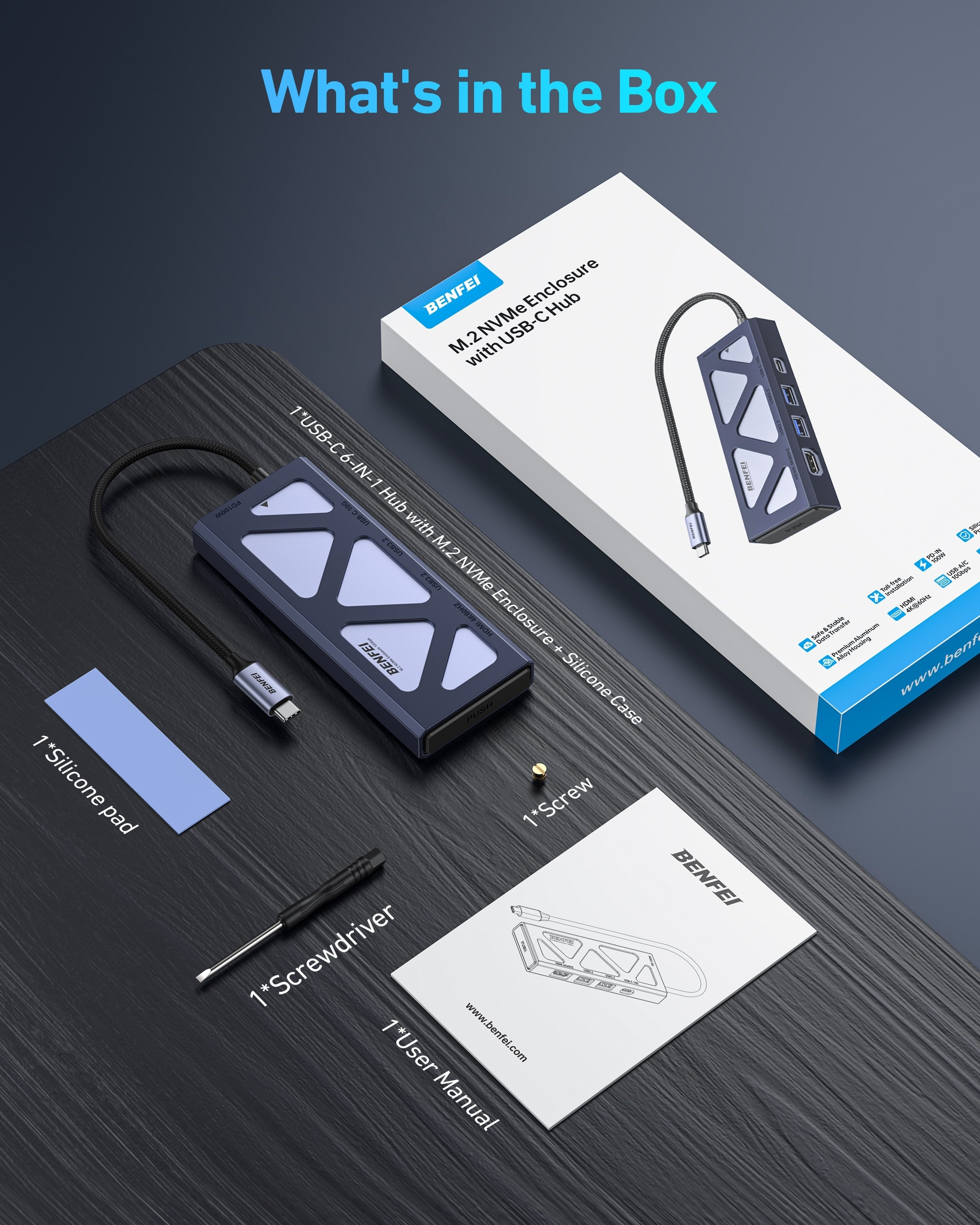 All-in-one 2-in-1 design: functions as a high-speed USB-C hub and an M.2 NVMe SSD enclosure, saving space and cost. Expand connectivity and storage with 2USB-A, 1USB-C (10Gbps), 100W PD charging, 4K@60Hz HDMI, and an M.2 NVMe SSD slot (supports 2230/2242/2260/2280).