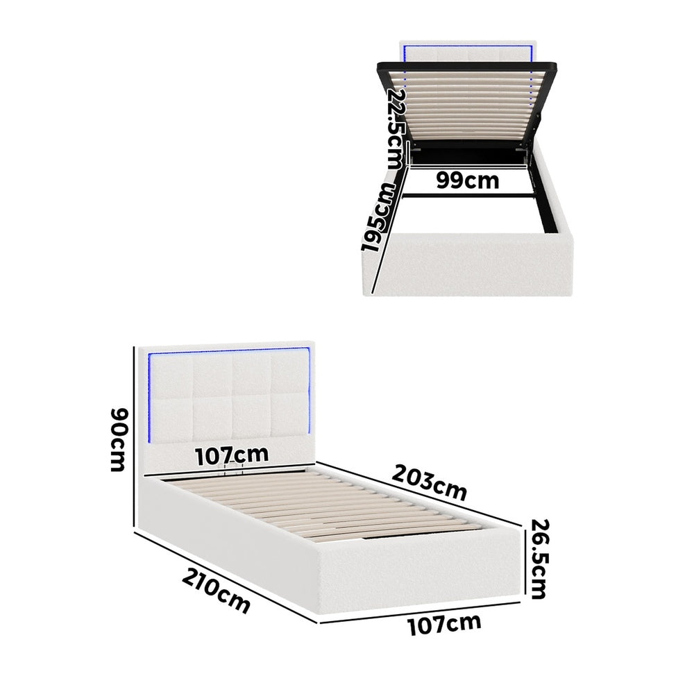 Oikiture Bed Frame Single Size RGB LED Gas Lift Storage Base White Boucle