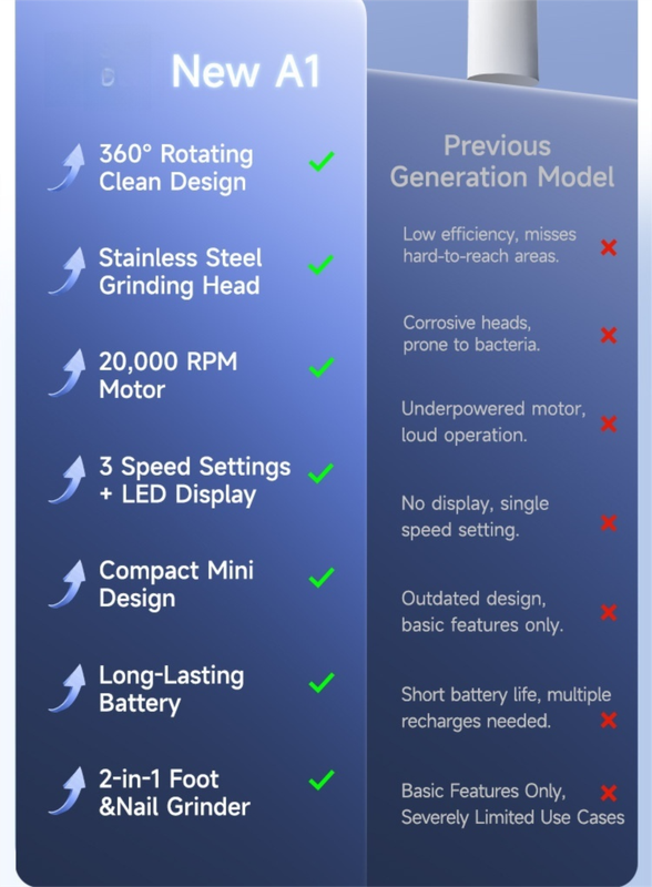 Restore your feet's natural softness with the A1 Smart Electric Foot Callus Remover. Engineered for efficiency and precision, this high-speed pedicure tool effortlessly removes dry, dead skin and stubborn calluses. With its intelligent 3-speed adjustment and dual 360°Rotating premium stainless steel grinding heads, you can customize your foot care routine to suit your skin's needs. Whether you're preparing for sandal season or maintaining everyday foot health, the A1 provides a safe, hygienic, and professional-grade solution in seconds.