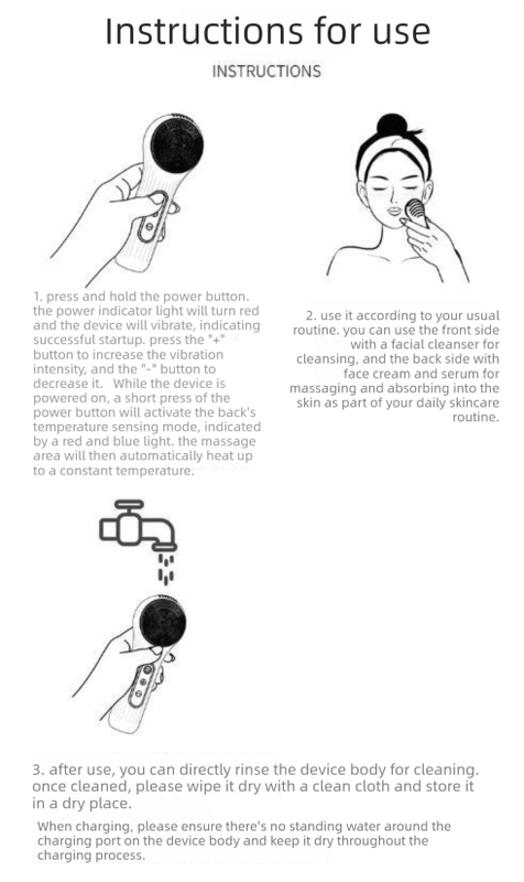 • Operation Modes: - Gentle Mode (1–2 levels): Soft pulsation for sensitive skin and light cleansing - Normal Mode (3–4 levels): Moderate vibration for daily facial care - Deep Clean Mode (5–6 levels): Powerful sonic waves to remove oil, dirt, and makeup residue