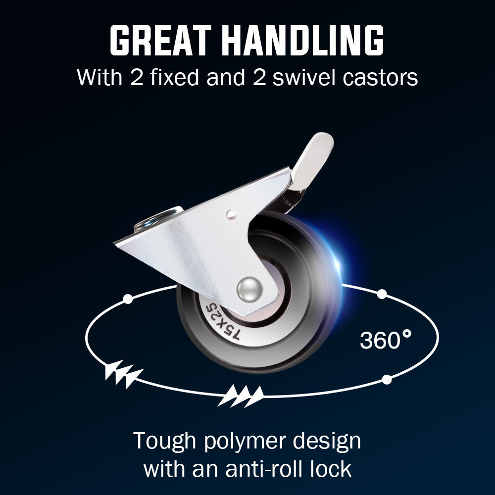 The cart rolls smoothly on hardened rubber castors. With two fixed and two 360-degree castors it doesn't wander about, and thanks to a locking castor you can secure it in position. This 3-shelf tool trolley offers an instant tool and equipment portability solution.