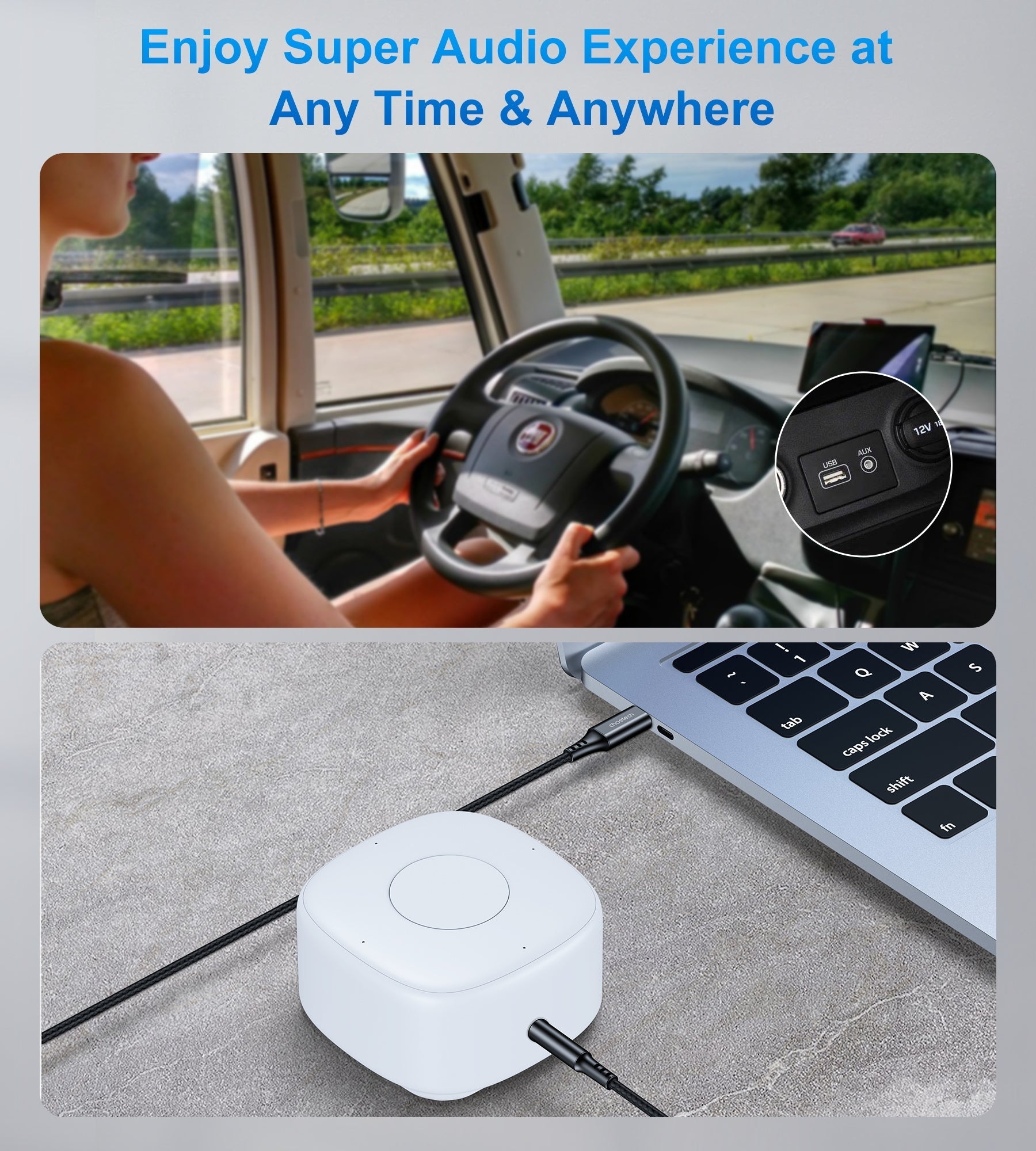 Choetech's USB-C to AUX Cable can easily connect your Type-C devices to car stereo, speakers, headphones or any device with 3.5mm audio jack or Aux-in port. No drivers or apps required, just easily plug and play. Let the music never stop.
