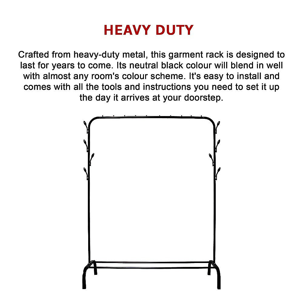Crafted from heavy-duty metal, this garment rack is designed to last for years to come. Its neutral black colour will blend in well with almost any room's colour scheme. It's easy to install and comes with all the tools and instructions you need to set it up the day it arrives at your doorstep. To clean it, all you need to do is wipe it down with a dampened clean cloth, and it's good to go. Get an early start on your spring cleaning and organising. Order your garment rack and organise your wardrobe today!