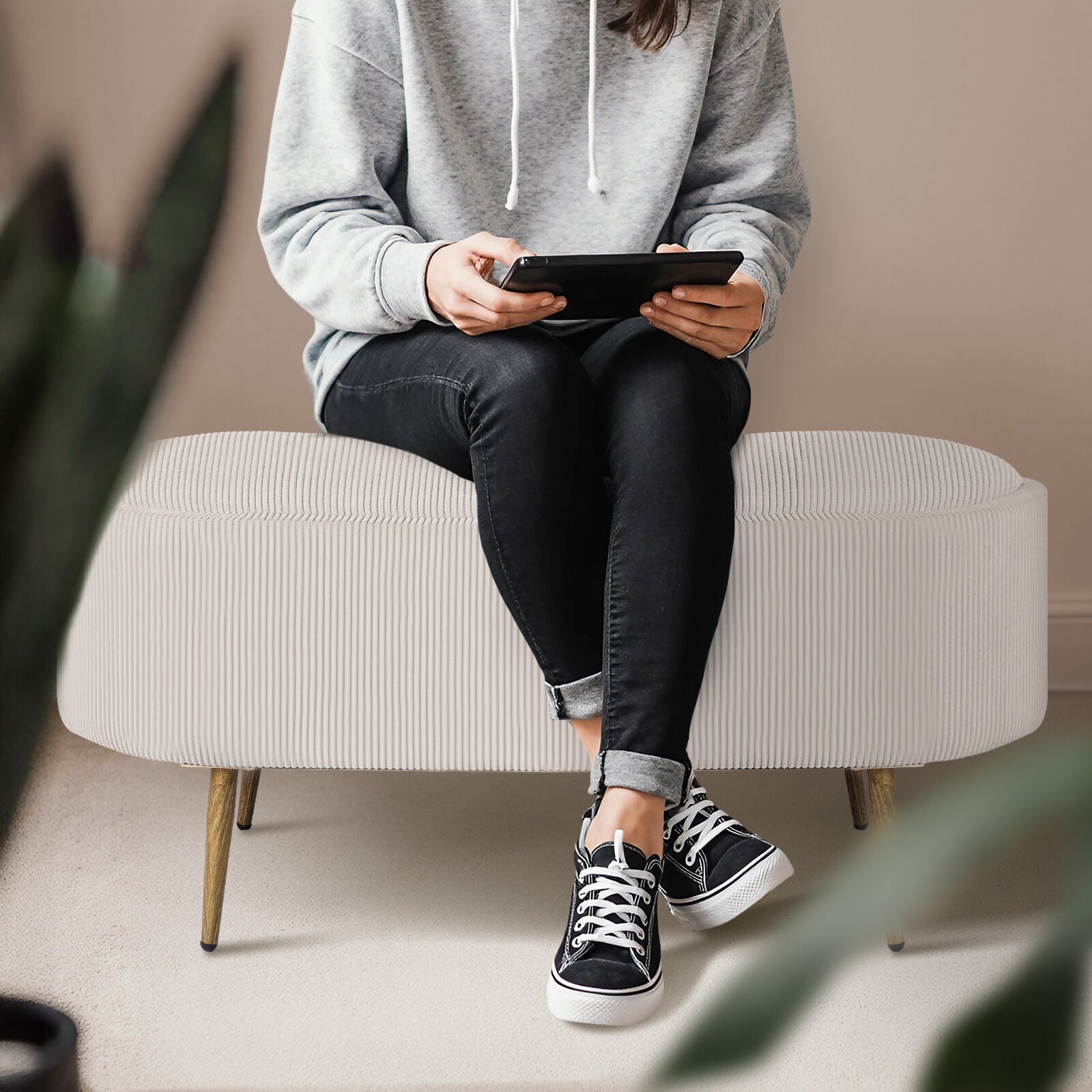 With soft ribbed corduroy fabric and plush foam cushioning, it invites you to sit back and unwind. Need extra table space? Just flip the lid to reveal a sleek tray surface, perfect for drinks, books. Inside, there's roomy storage for blankets, toys, or daily clutter.