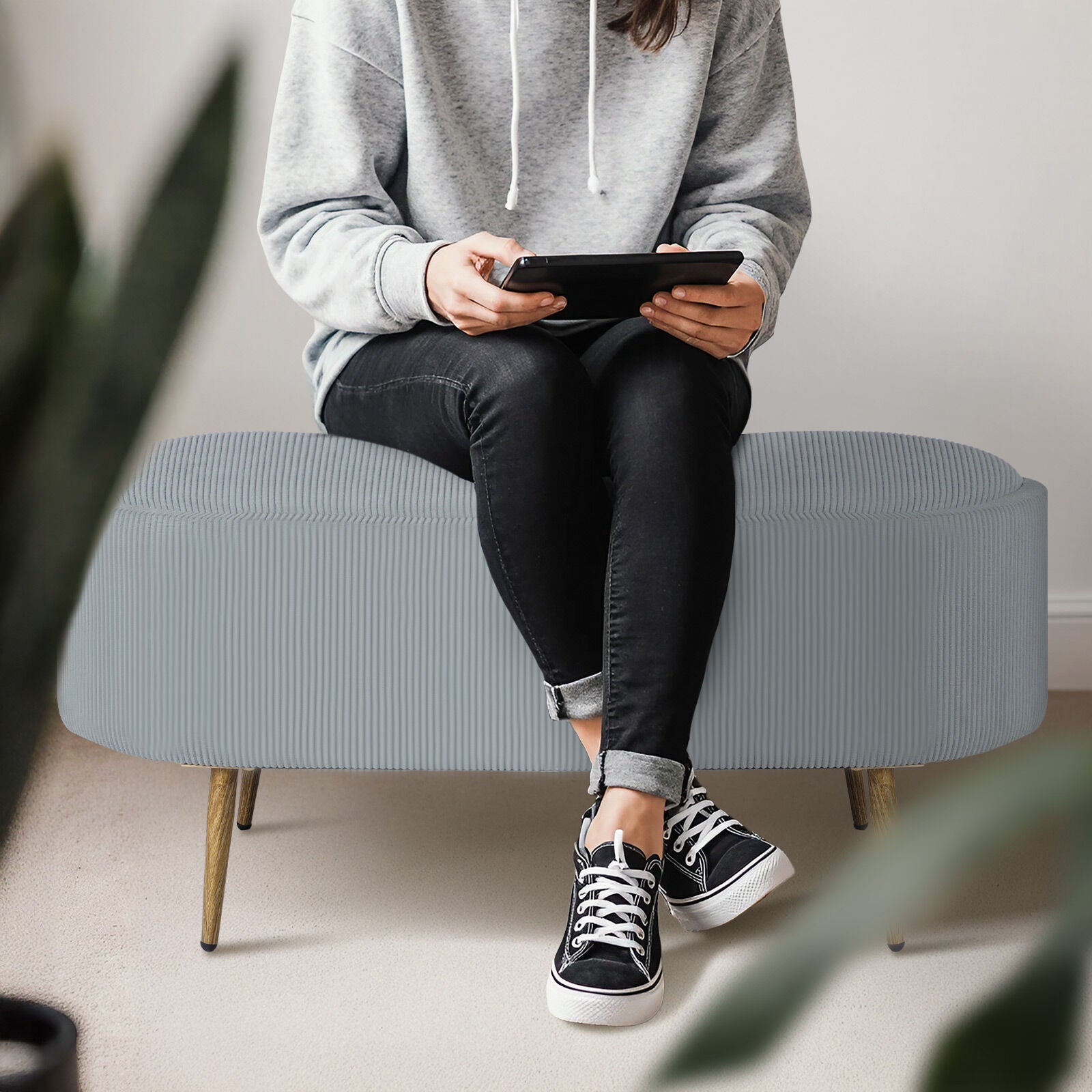 With soft ribbed corduroy fabric and plush foam cushioning, it invites you to sit back and unwind. Need extra table space? Just flip the lid to reveal a sleek tray surface, perfect for drinks, books. Inside, there's roomy storage for blankets, toys, or daily clutter.
