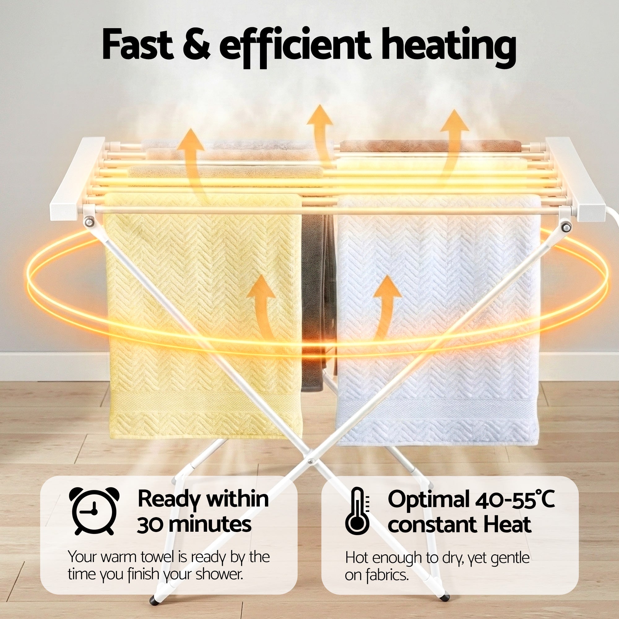 Speed up laundry day with the Devanti Heated Towel Rail. This 120W electric clothes airer features 8 heated bars and a lightweight aluminium frame. Its foldable design makes it the perfect portable drying rack for small spaces. Gentle on fabrics and easy to store. Plug and play convenience.