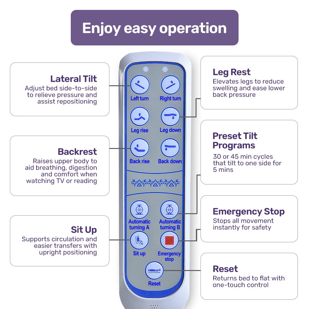 A key feature is its automatic turning assist function, which gently turns the user from their back to either side and back. This can be done at preset intervals. This supports circulation, reduces the risk of pressure injuries, and aids repositioning, minimising physical exertion and stress on the carer. Carers can rely on this feature to maintain user comfort through the night, significantly reducing fatigue and physical strain.