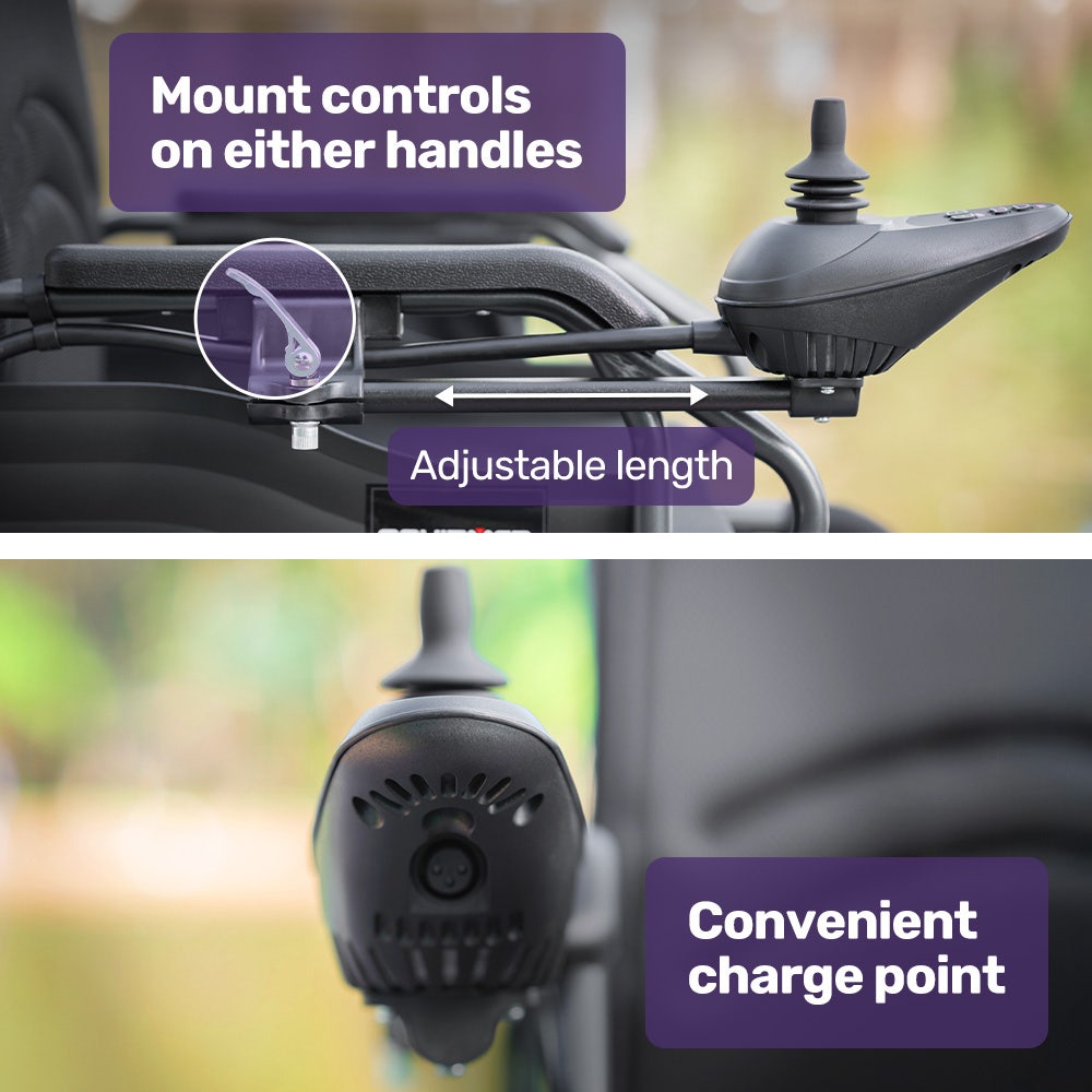 Steering is intuitive using the joystick that can be mounted on either the left or right-hand side, and with easy-to-read LED controls. You can travel along at a sensible speed of up to 6km/h, which is a brisk walking pace.