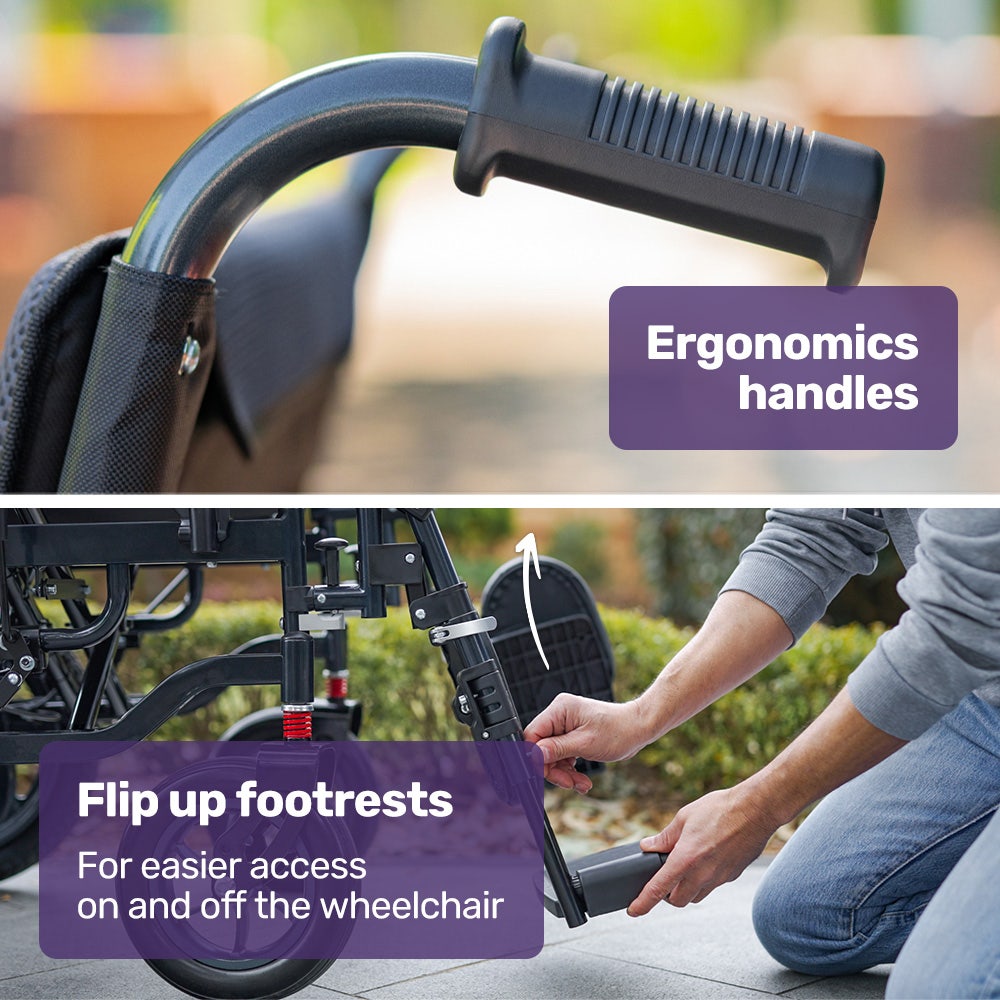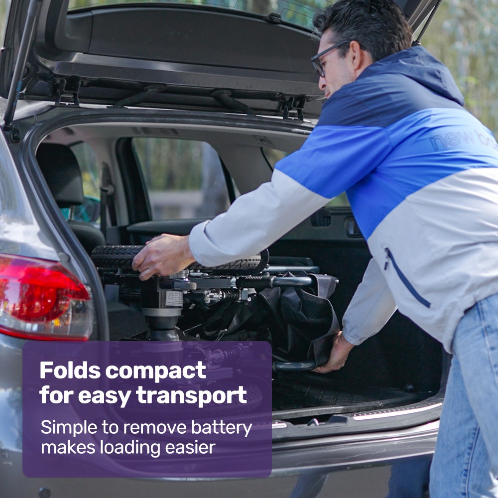 The Equipmed motorised wheelchair is quick to fold. Plus, a sturdy steel frame and easy-to-remove lithium battery mean that it is as light as possible for loading into a car boot or moving into a space-saving storage position.