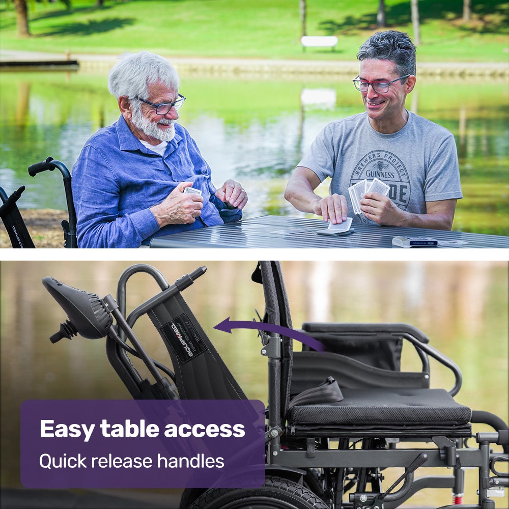 Getting on and off this Equipmed Power Wheelchair is easy thanks to swing-up armrests and the swing-up footrest. The retracting armrests also give you the option of dining at a table.