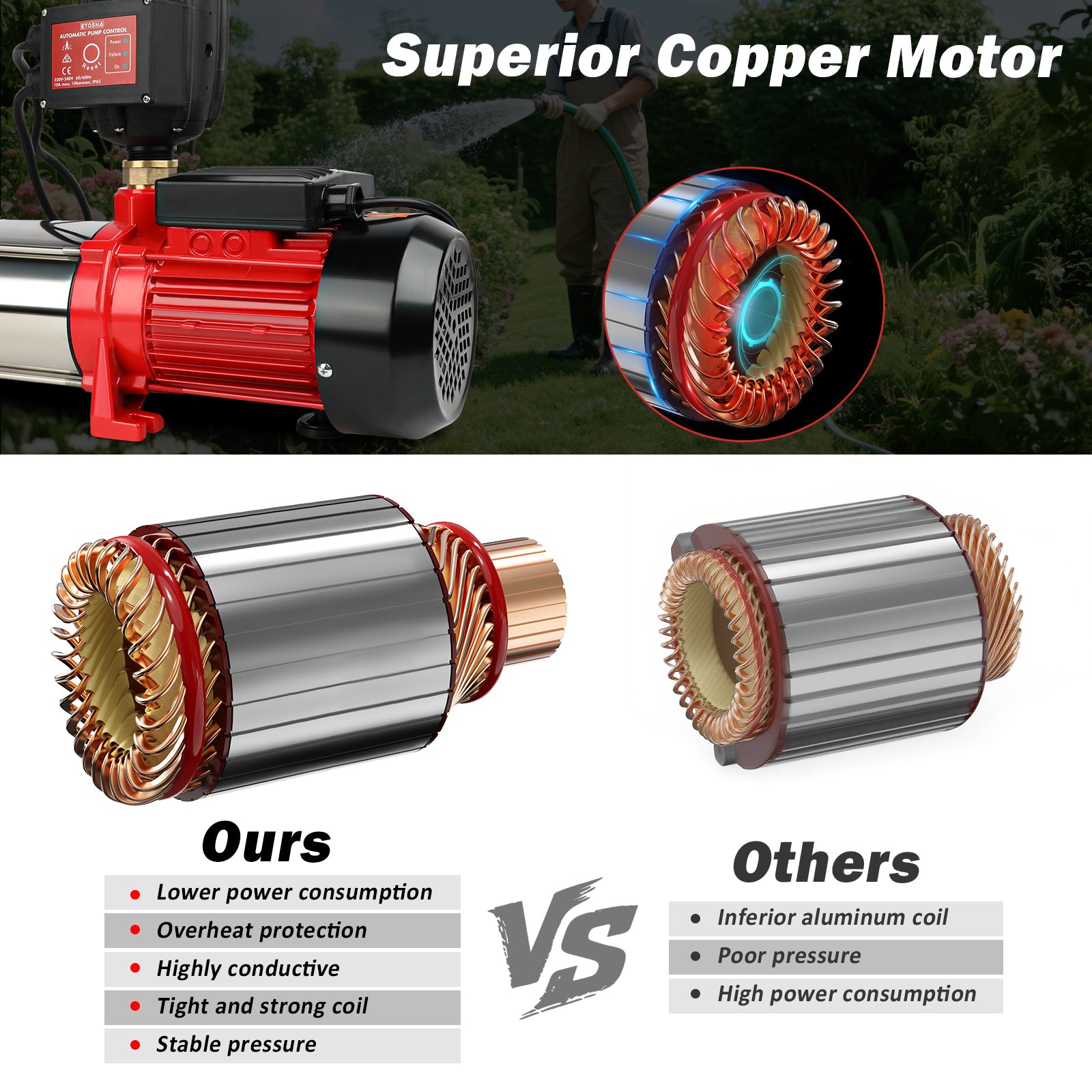 High Power Energy Efficiency: Equipped with a heavy-duty 2000W rated motor, it delivers ample water pressure and flow to easily cover large-area irrigation. The highly conductive copper motor ensures superior electrical efficiency.
