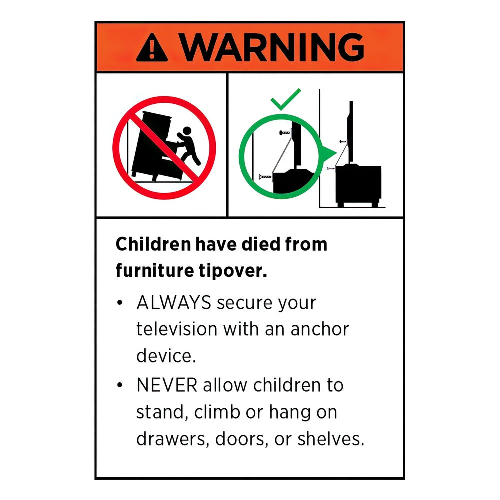 WARNING 2: Children have died from furniture tipping over. Always secure furniture to prevent serious injury or death. Never allow children to climb or stand on furniture.