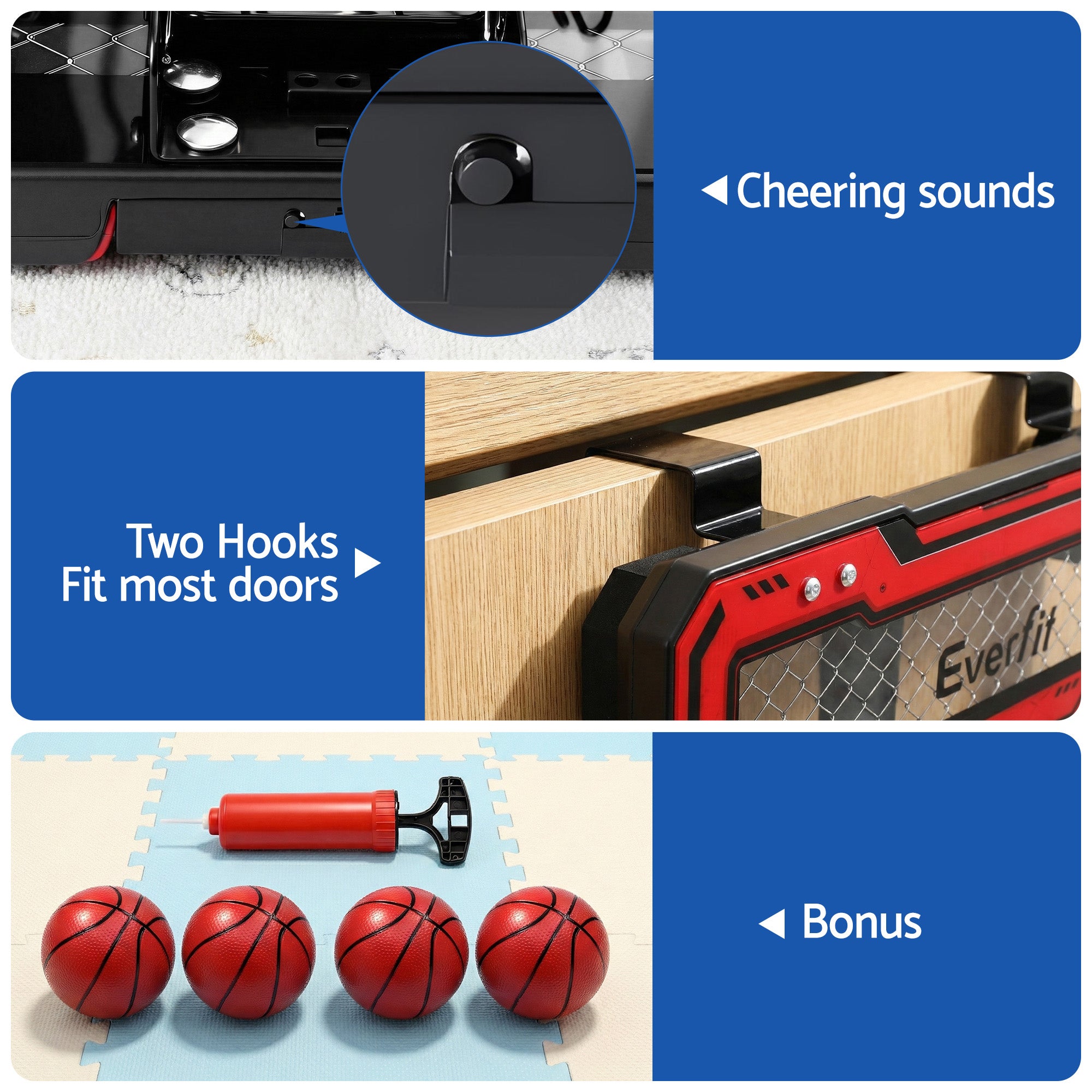 Transform your space with the Everfit Mini Basketball Hoop. Perfect for the bedroom door or office, this indoor basketball hoop features a shatterproof backboard, LED lights, and an electronic scoreboard. Includes 4 balls. The ultimate over the door basketball hoop set.