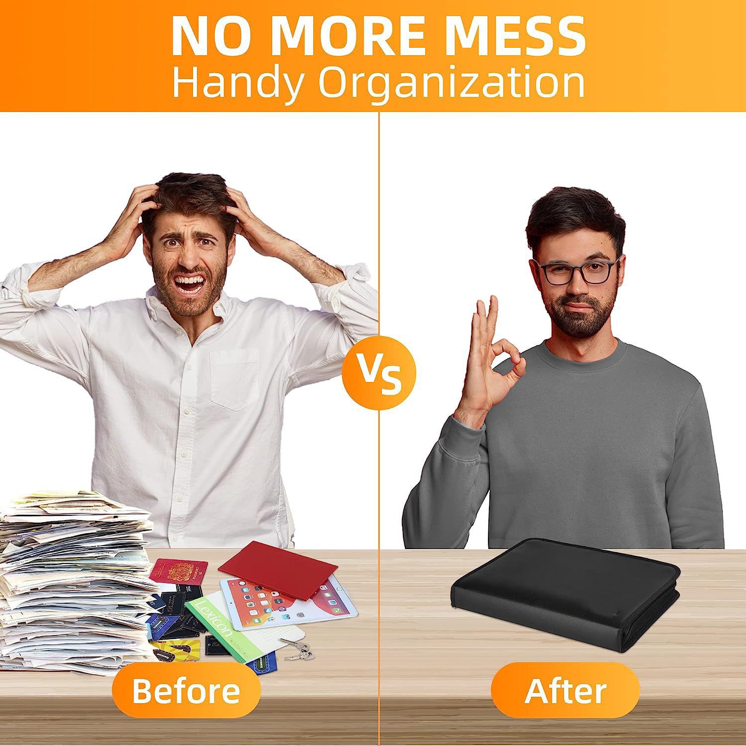 Protect your most important documents and valuables with our Fireproof and Waterproof Expanding File Folder. This multifunctional organizer is constructed from SGS-tested fireproof and waterproof silicone-coated fabric to safeguard your files from fire and water damage. It features a large-capacity design with a 26-pocket expanding file folder, multiple interior pockets, card slots, and mesh bags, providing a comprehensive solution for organizing certificates, passports, cards, and A4/Letter size papers. The folder comes with colorful labels for easy classification and is secured by a water-resistant zipper. A sturdy strap on the back allows you to slide it over luggage handles, making it perfect for secure travel and home storage.