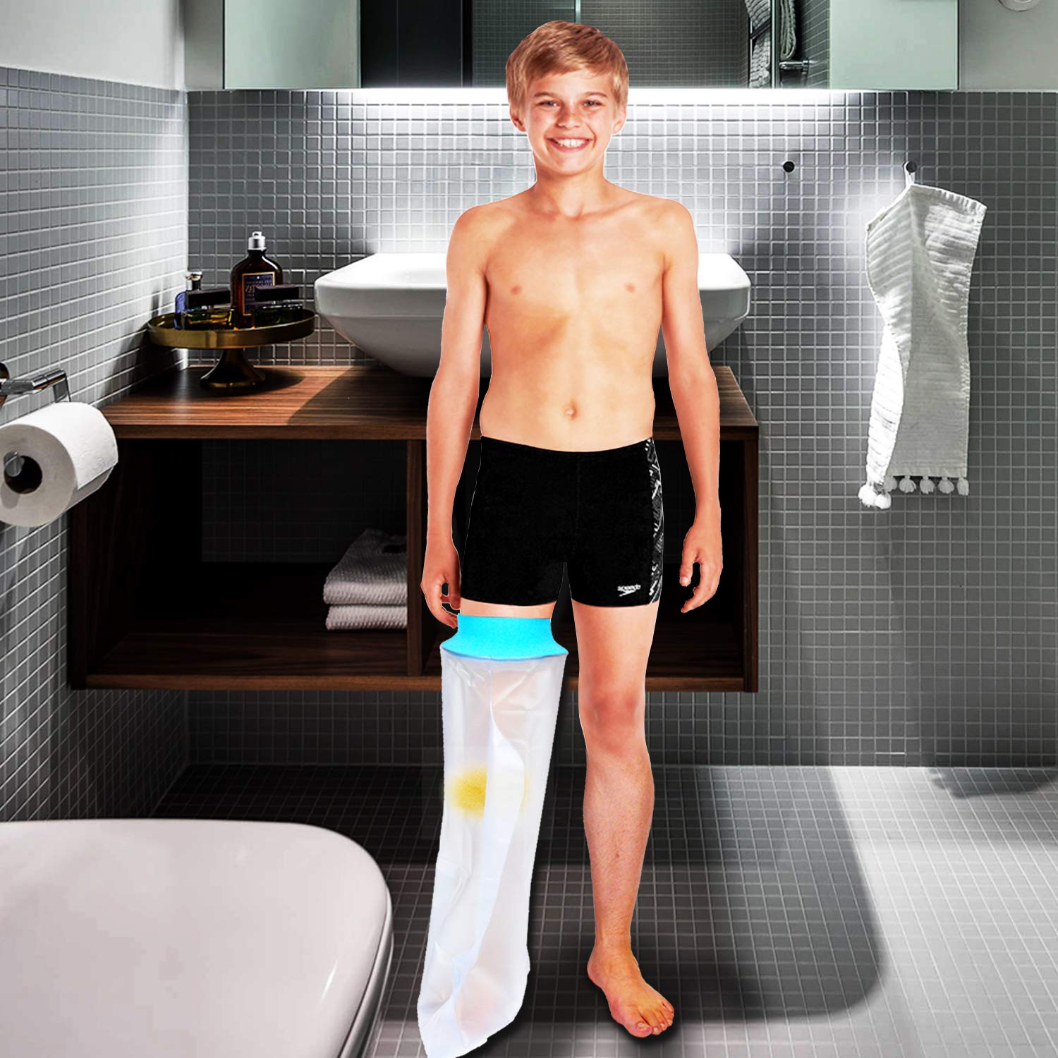 Keep your childs entire leg dry and protected during showers, baths, or light water exposure with this full-leg waterproof sleevedesigned specifically for kids to safeguard casts, bandages, or sensitive skin from moisture. Made from high-quality, flexible PVC and reinforced with a soft neoprene seal ring at the thigh, it creates a snug, reliable barrier that effectively blocks water while allowing comfortable movement. The transparent body lets you monitor the covered area without removal, and the stretchable design fits most childrens legsfrom foot to upper thigh. With an upgraded sealing system and no bulky plastic rings, its easy for caregivers to put on and take off, and older kids can manage it independently under supervision. Built for durability, the material resists tearing and holds up through repeated use. After each shower, simply hang it to air dry before folding and storingno need for frequent replacements. Whether your child is recovering from surgery, managing a fracture, or protecting a wound, this reusable sleeve offers dependable protection and peace of mind. Please note: this is a general-purpose personal care accessory, not a medical device. For optimal performance, ensure proper sizing and secure placement before water contact. While no product can be 100% waterproof due to natural material behavior, its advanced design delivers highly effective moisture resistance under normal conditions. Adult supervision is strongly recommended during use to ensure safety and correct fit.