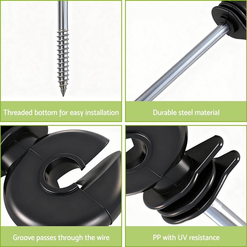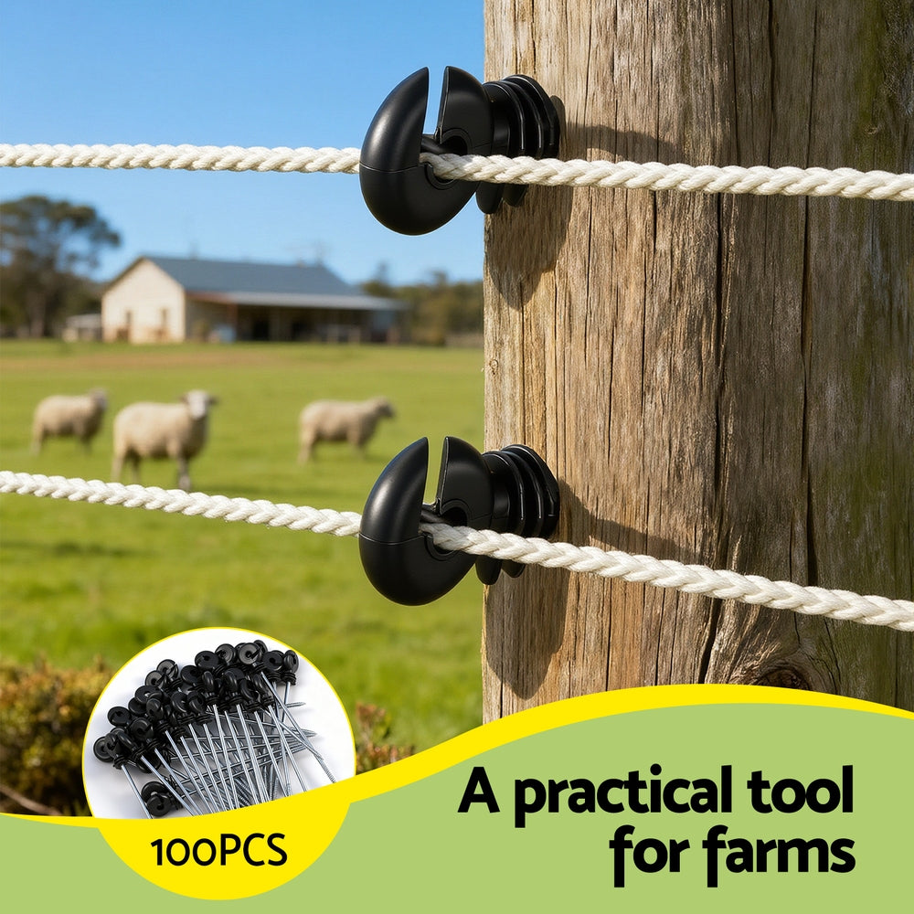 This electric fence kit includes 100pcs electric fence insulators, essential for any electric fencing setup. These electric fence pinlock insulators provide good insulation for secure attachment. Made from high-strength, UV-resistant PP, they are built to withstand Australian conditions. They are versatile and suitable for wire, polywire, rope, and electric fence tape, functioning effectively as start, end, corner, or line insulators.