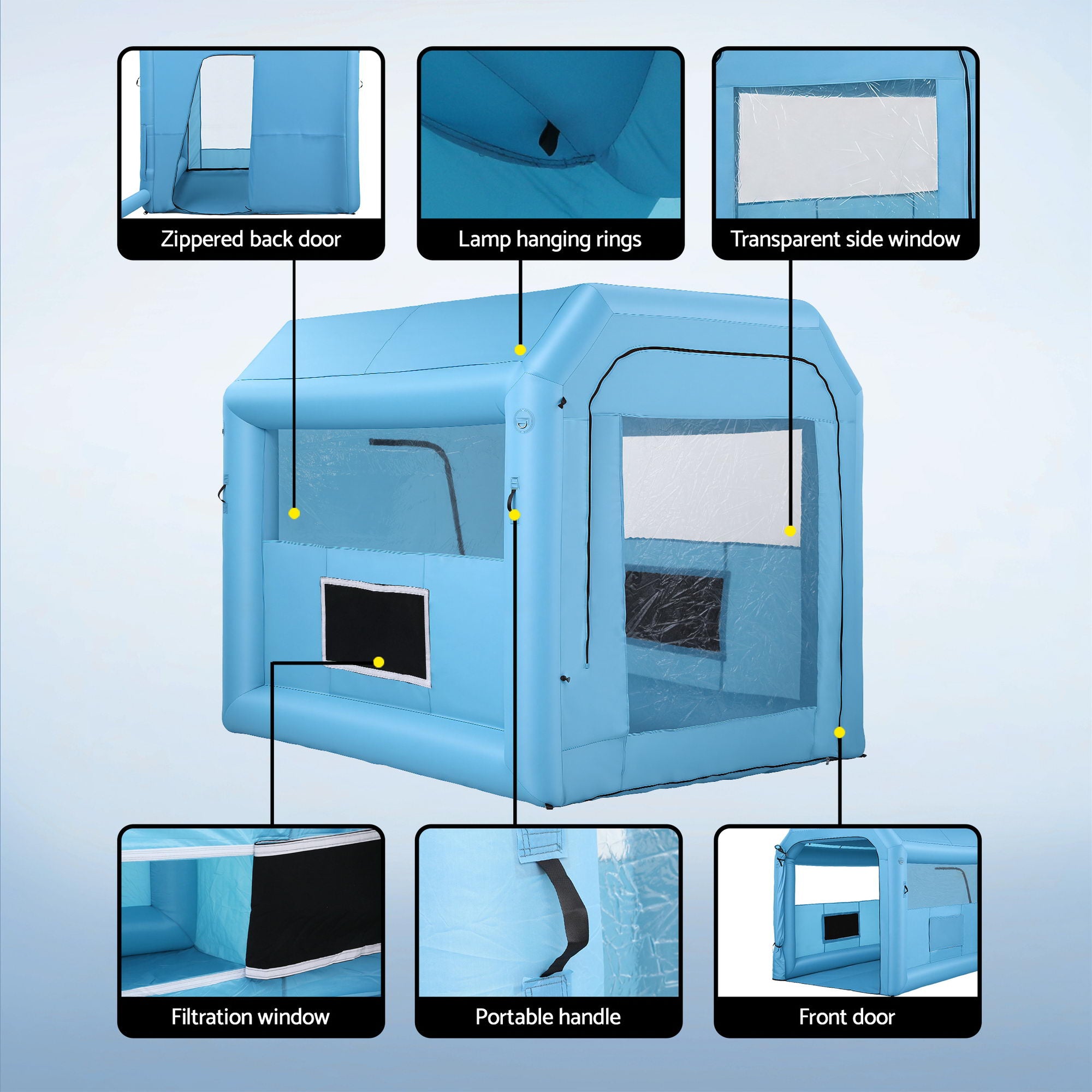 For all your large paint jobs, look no further than the Inflatable Paint Booth from Giantz. Made with high-quality 201D oxford cloth and 0.4mm PVC material that is water, dust and UV-resistant, this booth is durable and built to last. The 3-layer filtration system ensures that your workspace stays clean and free of harmful particles, while the 750W electric inflation blower provides both inflation for the structure and ample airflow for optimal painting conditions. Featuring a large front door and a convenient zippered back door, this booth is easy to access and maneuver. The two filtration windows and four bright transparent windows allow for maximum visibility and lighting, with a lamp-hanging ring for added convenience. The deflation port makes short work of packing down the structure. The portable handle makes it easy to transport, and the included carry bag ensures that you can take it with you wherever you go. Whether you're a professional painter or a DIY enthusiast, the Giantz Inflatable Paint Booth is the perfect addition to your workspace.