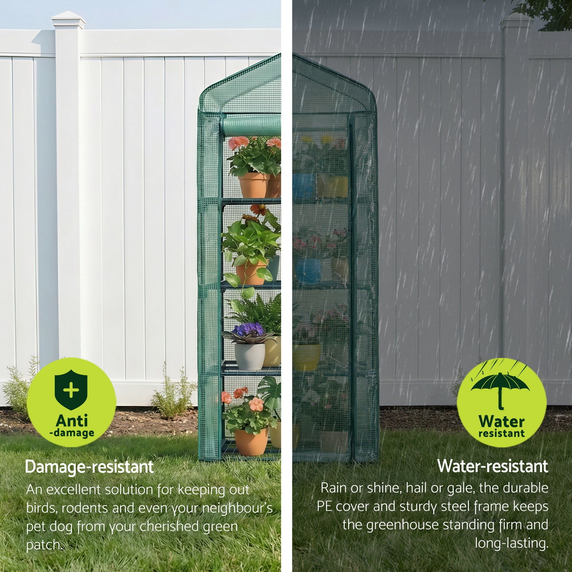 Growing greens in Australia can be challenging due to weather fluctuations. Our all-weather Greenhouse provides a consistent environment for optimal growth year-round. Perfect for home or light commercial use, it protects against extreme weather and pests. The durable PVC greenhouse retains heat for better growth and comes with all necessary fittings for easy setup. Enjoy fresh, home-grown greens and save money on groceries. Order your greenhouse today! Note: Position your greenhouse in a sheltered spot for best results.