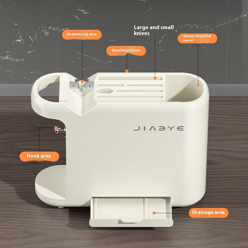 This multifunctional kitchen knife rack is the perfect solution for keeping your kitchen organized and your knives in top condition. Featuring a built-in knife sharpener, this organizer also stores knives, chopsticks, cutting boards, and pot lids in one compact unit. Made from durable PP material with a sleek design, it's both practical and space-saving. Ideal for home chefs, it helps maintain a tidy kitchen while ensuring your tools are easily accessible when needed.