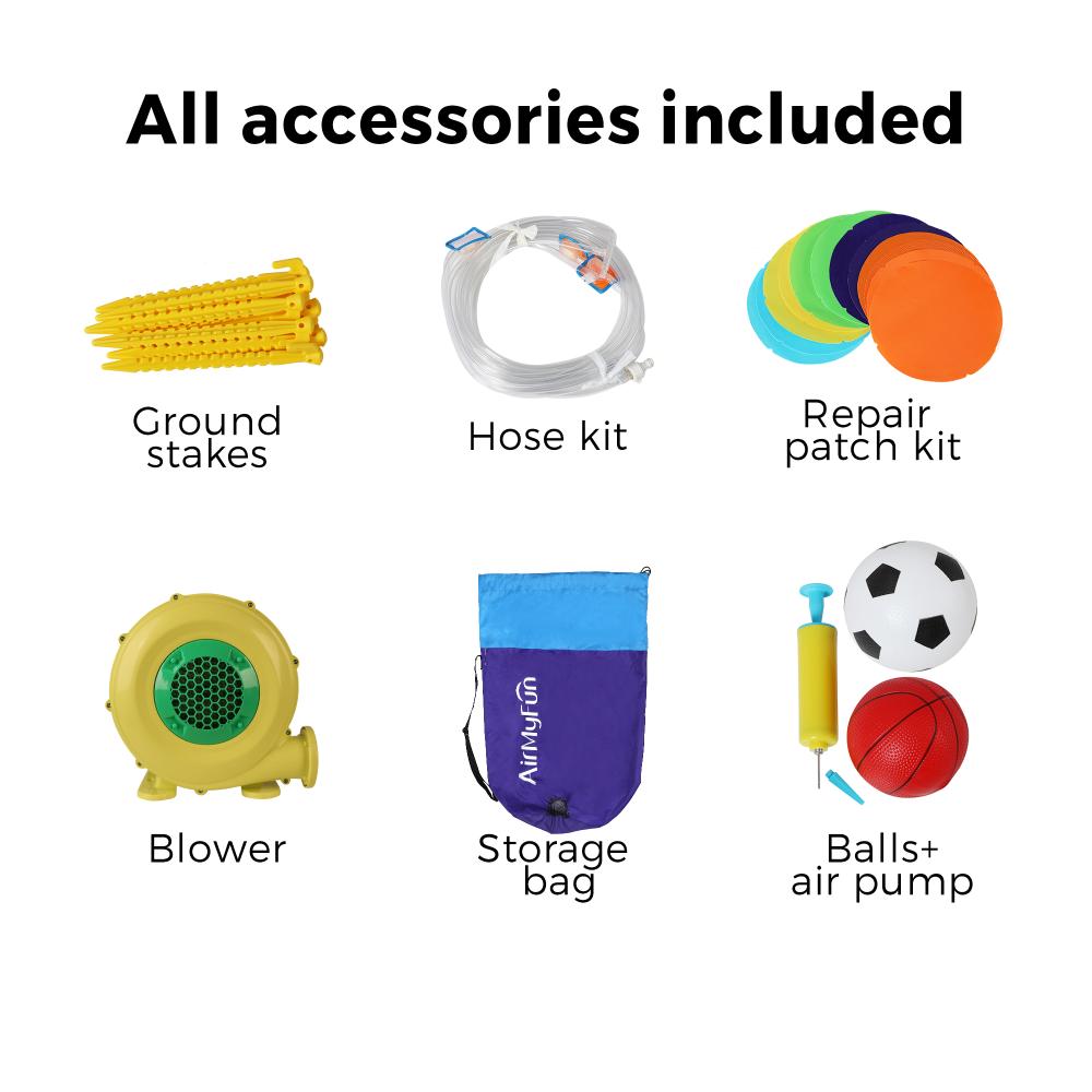 Setting up the bounce house is as simple as attaching the Australian-approved 450W blower to the inflatable and letting it do all the hard work in inflating the structure within 3 minutes. Then just lead your water hose to the structure and fill it up. To disassemble, just unplug, drain the water and release the air for a hassle-free takedown. Also included with the bounce house are an emergency repair kit, storage bag, bouncer stakes and a water spray hose assembly.
