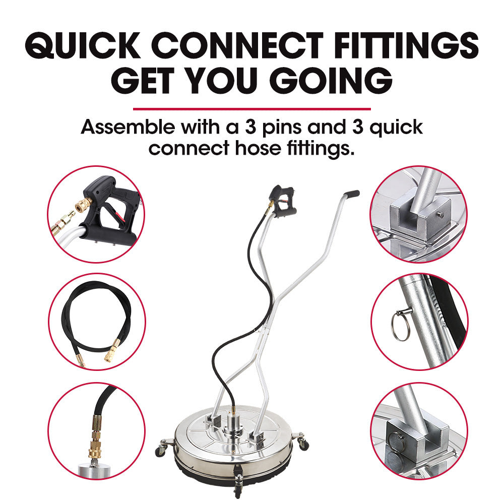 The 24' Stainless Steel Pressure Washer Surface Cleaner Attachment is the perfect tool to clean your concrete driveway, patio, deck or garage floor. This easy gliding disk puts powerful cleaning and ease of use at your disposal with the super-wide 61cm cleaning area.