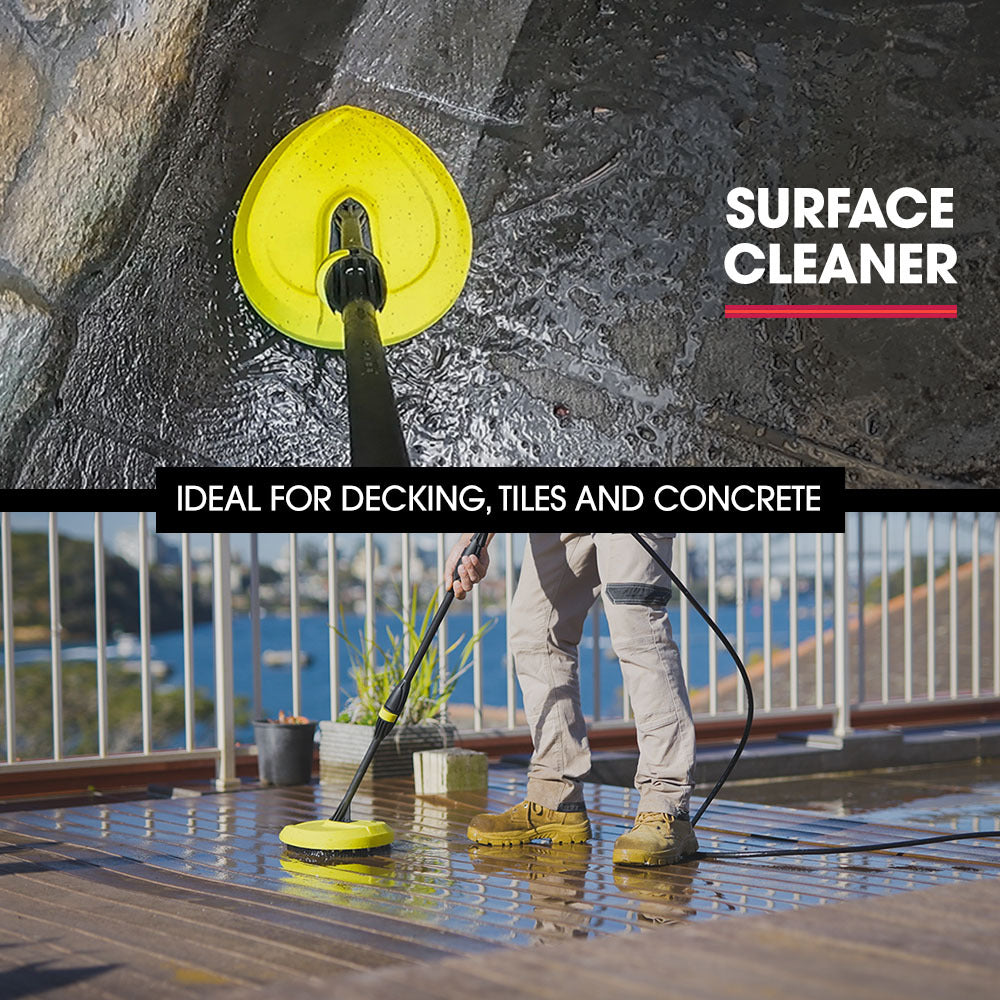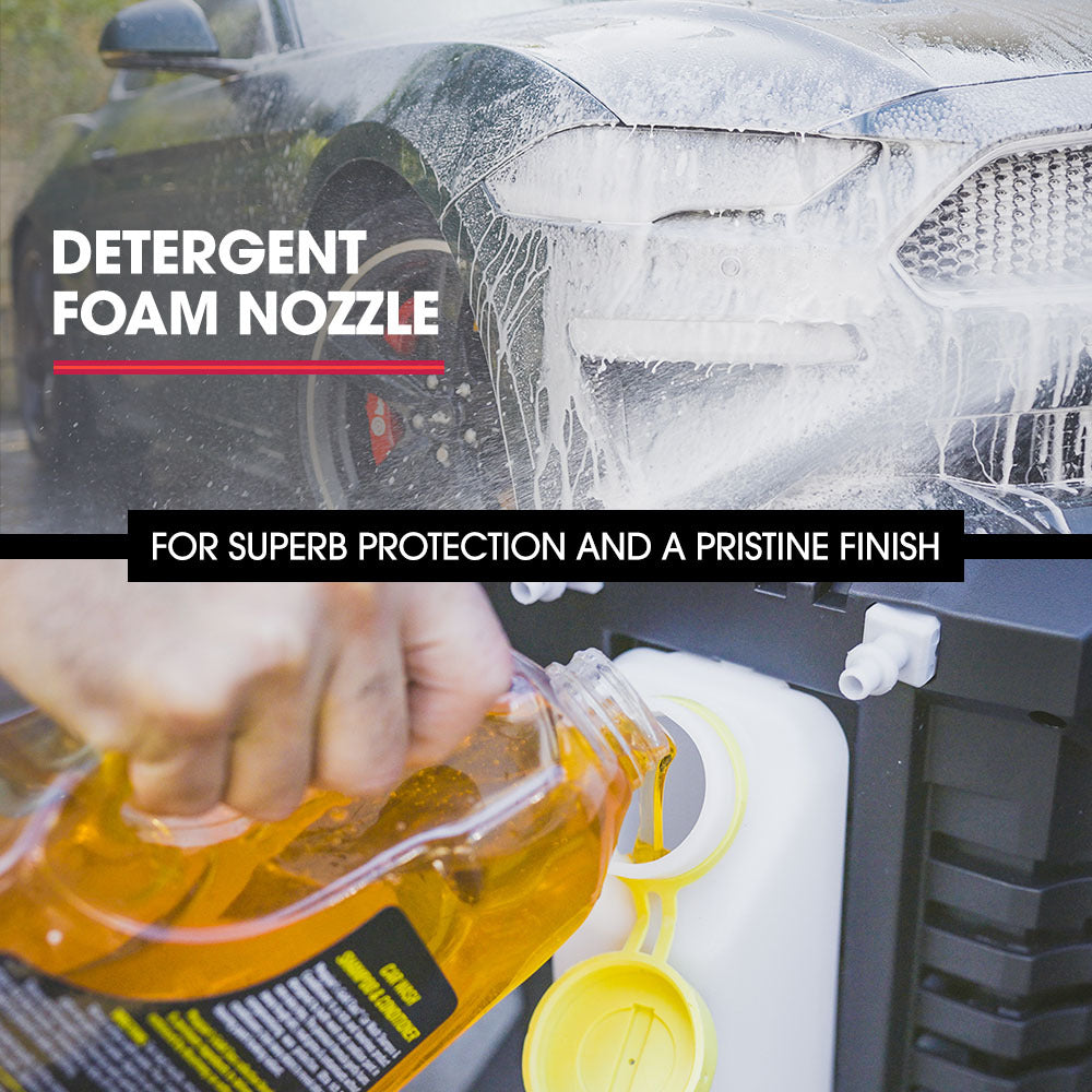 Attaching the detergent bottle and the detergent nozzle allows you to easily apply suds when cleaning cars while the brush head attachment provides extra scrubbing power. The surface cleaner head is ideal for decks, paths and driveways. With a Vari-Nozzle, a Detergent Nozzle and a Turbo head, this High Pressure Washer offers versatile cleaning options to suit any task!
