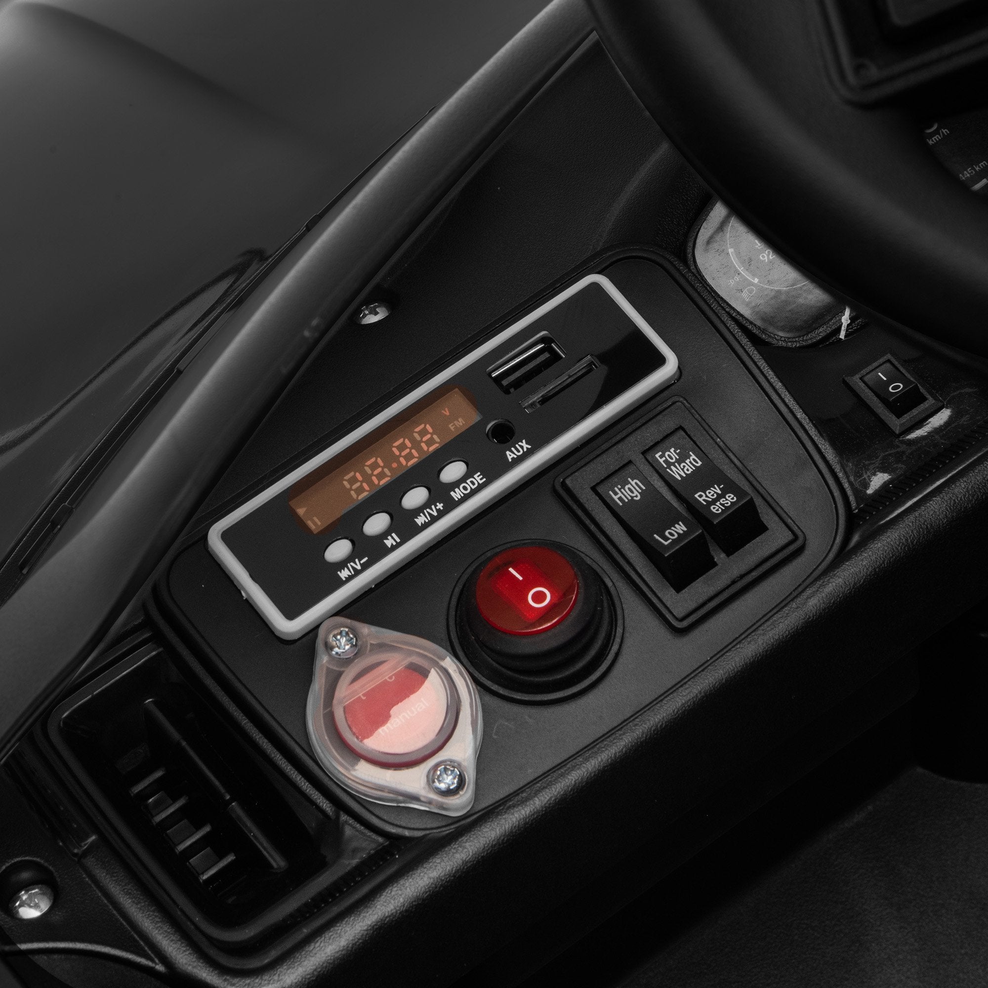 Kids can drive using the foot pedal driving system while parents can stay in control with the R/C remote. A one-start button makes it simple to power up, while the seatbelt, four-wheel suspension, working headlights and horn sounds add to the realistic drive. Complete with a protective car cover, this ride-on offers endless adventures with a race-day thrill.
