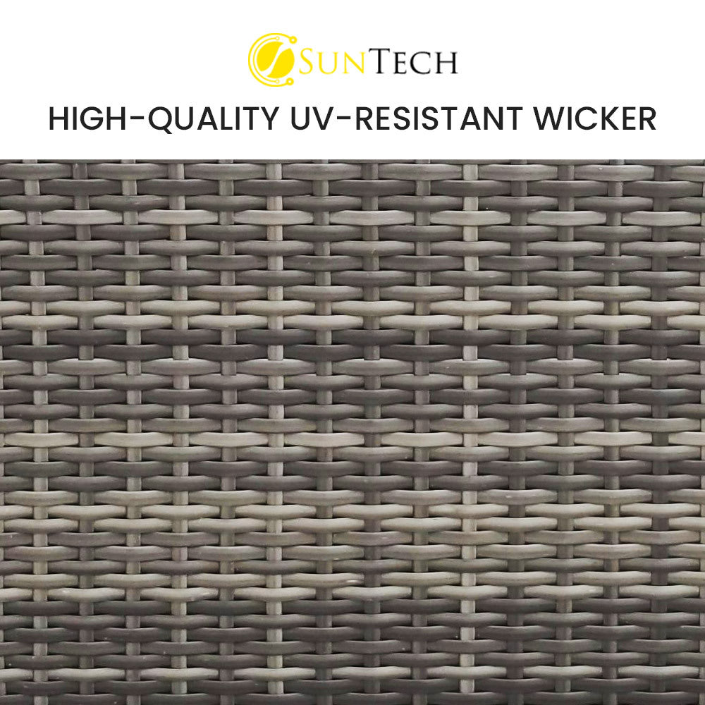 The set includes ultra-comfy 8cm thick water-resistant seat cushions, generous backrest cushioning and a premium throw cushion. The high-quality UV-resistant handwoven Suntech wicker in Marl Grey weave has a premium natural textured look. With a modular design comprising a sofa, one corner sofa and an ottoman, you can set it up in whatever configuration works best for you. This London Rattan outdoor lounge setting is a great addition to any outdoor space.
