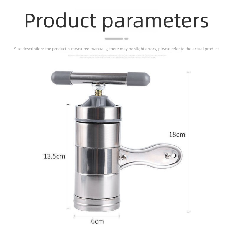 Made from high-quality stainless steel, this handheld noodle press features a robust cylindrical barrel and a T-shaped rotating handle that delivers smooth, consistent pressure. The included dies let you create a variety of traditional and modern noodle shapes—perfect for Chinese hand-pulled noodles, egg noodles, dumpling wrappers, or regional specialties like Hulao noodles. The cast iron screw rod enhances strength and stability during operation. Designed for ease of use, the machine can be fully disassembled for thorough cleaning after each use. Whether you're cooking for family or preparing meals in bulk, this tool simplifies fresh noodle making at home.