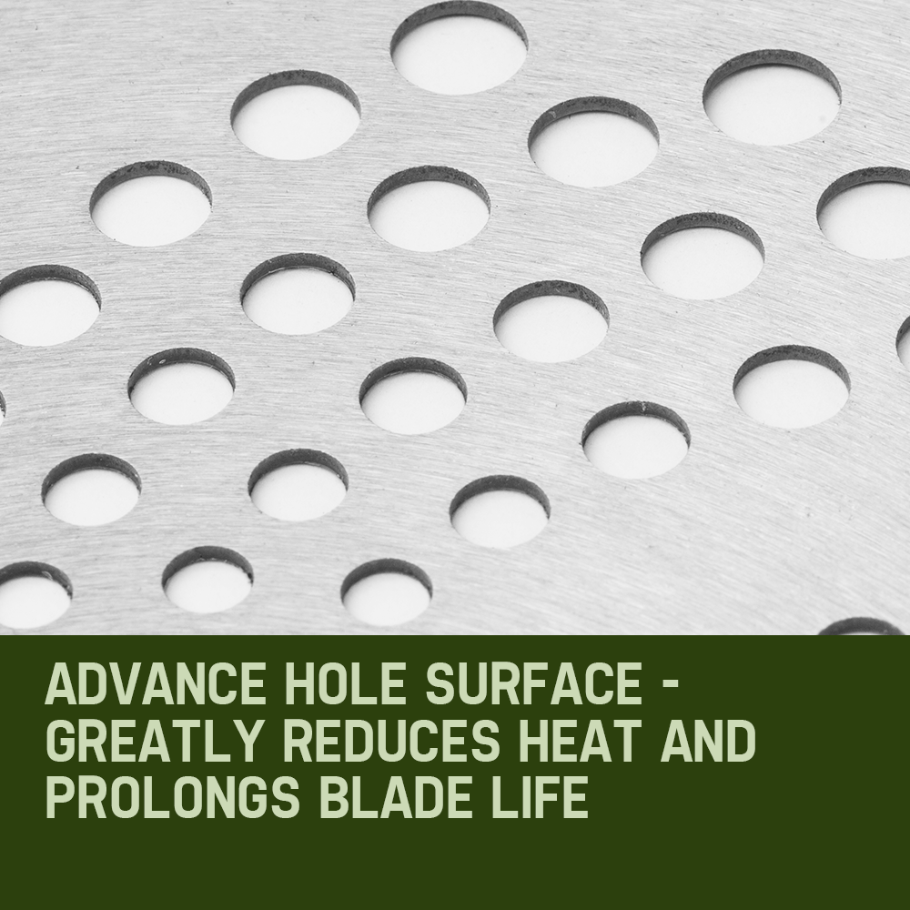 Composed of high grade light weight alloy, these true commercial blades feature aggregated carbide tipped teeth that do not require sharpening and last up to ten times longer than regular blades. Meanwhile, the advanced tear-hole surface structure greatly reduces heat and prolongs blade life.